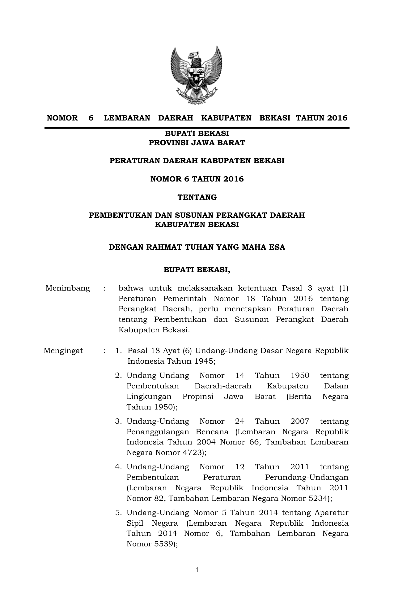 PERDA Nomor 6 Tahun 2016 | Peraturan Daerah Nomor 6 Tahun 2016 tentang PEMBENTUKAN DAN SUSUNAN PERANGKAT DAERAH KABUPATEN BEKASI