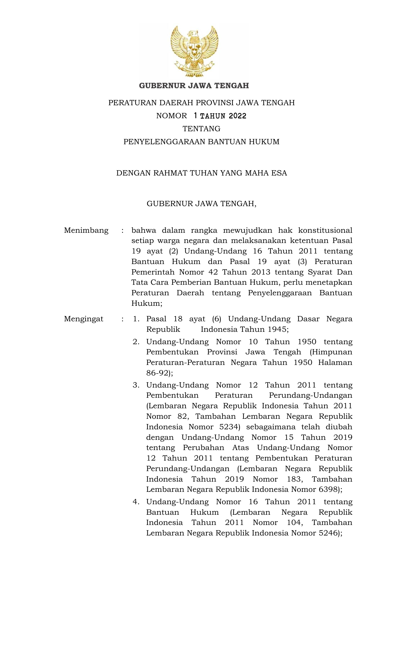 PERDA Nomor 1 Tahun 2022 | Peraturan Daerah Nomor 1 Tahun 2022 tentang PENYELENGGARAAN BANTUAN HUKUM