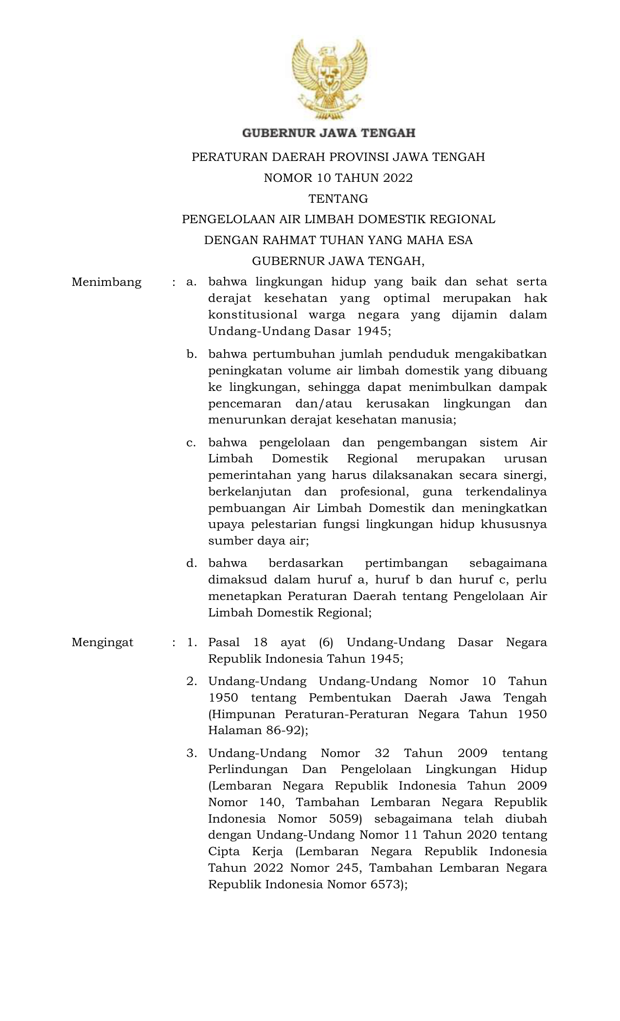 PERDA Nomor 10 Tahun 2022 | Peraturan Daerah Nomor 10 Tahun 2022 tentang PENGELOLAAN AIR LIMBAH DOMESTIK REGIONAL