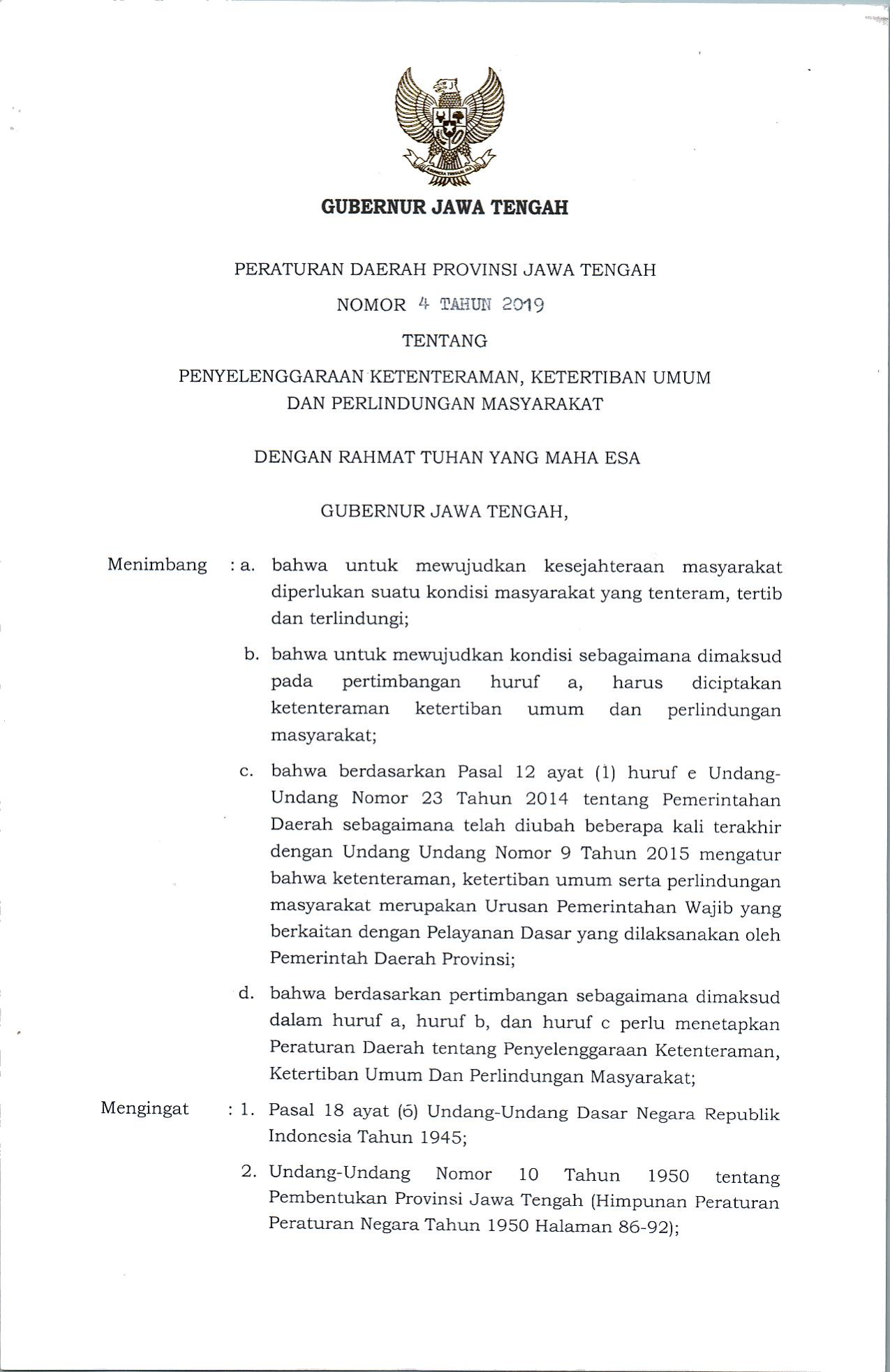PERDA Nomor 4 Tahun 2019 | Peraturan Daerah Nomor 4 Tahun 2019 tentang PENYELENGGARAAN KETENTERAMAN, KETERTIBAN UMUM DAN PERLINDUNGAN MASYARAKAT