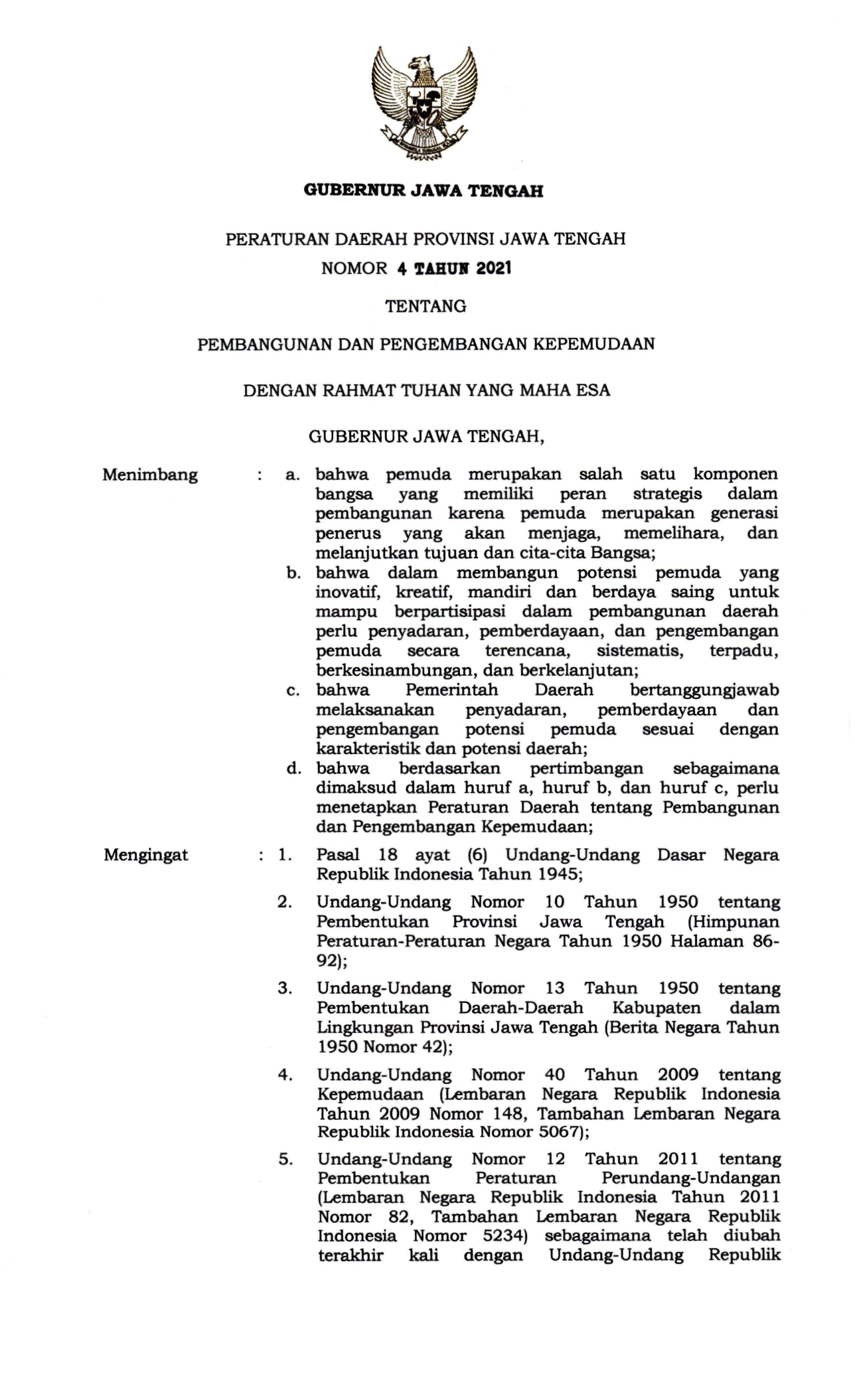 PERDA Nomor 4 Tahun 2021 | Peraturan Daerah Nomor 4 Tahun 2021 tentang PEMBANGUNAN DAN PENGEMBANGAN KEPEMUDAAN
