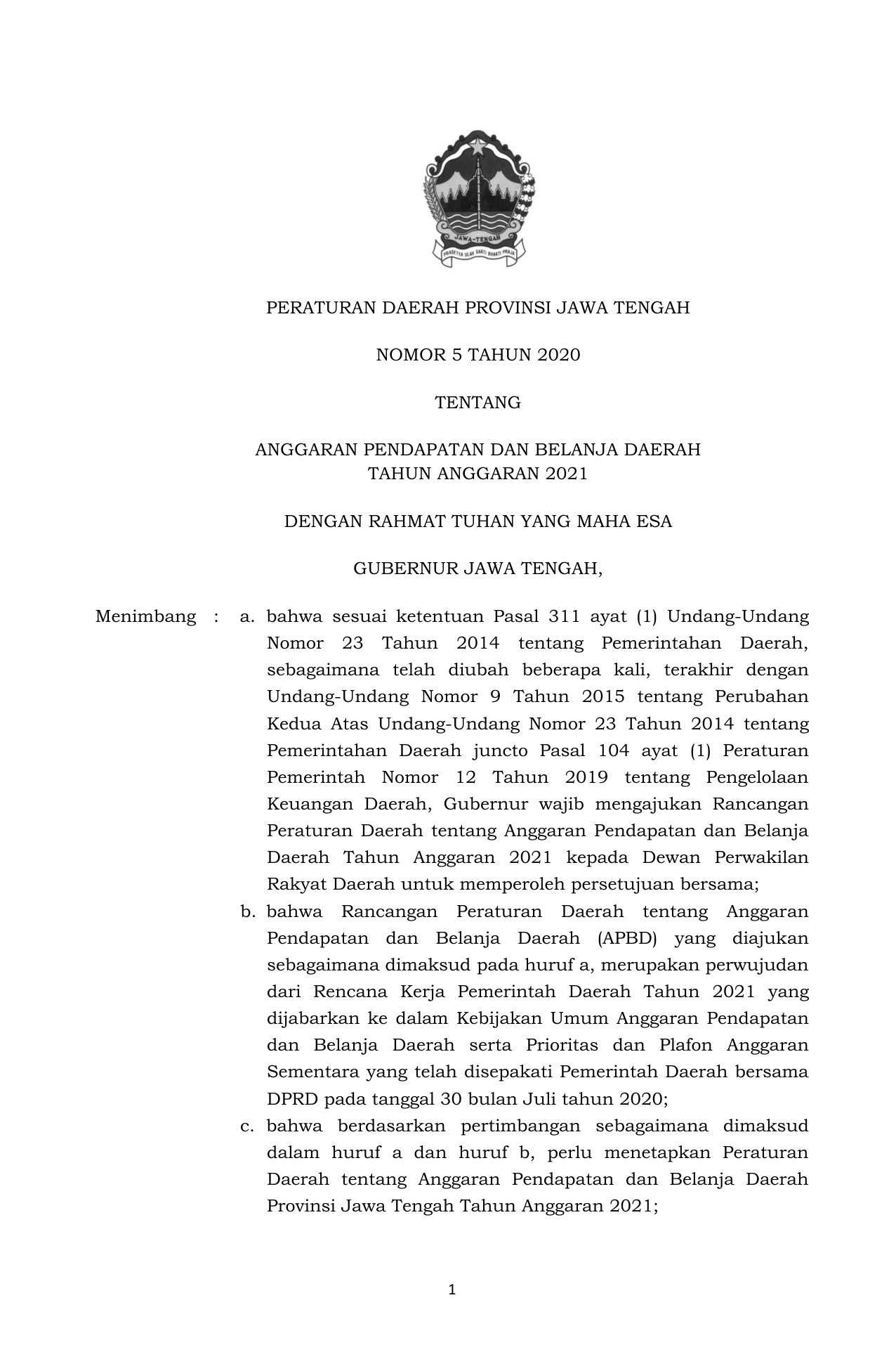 PERDA Nomor 5 Tahun 2020 | Peraturan Daerah Nomor 5 Tahun 2020 tentang ANGGARAN PENDAPATAN DAN BELANJA DAERAH TAHUN ANGGARAN 2021