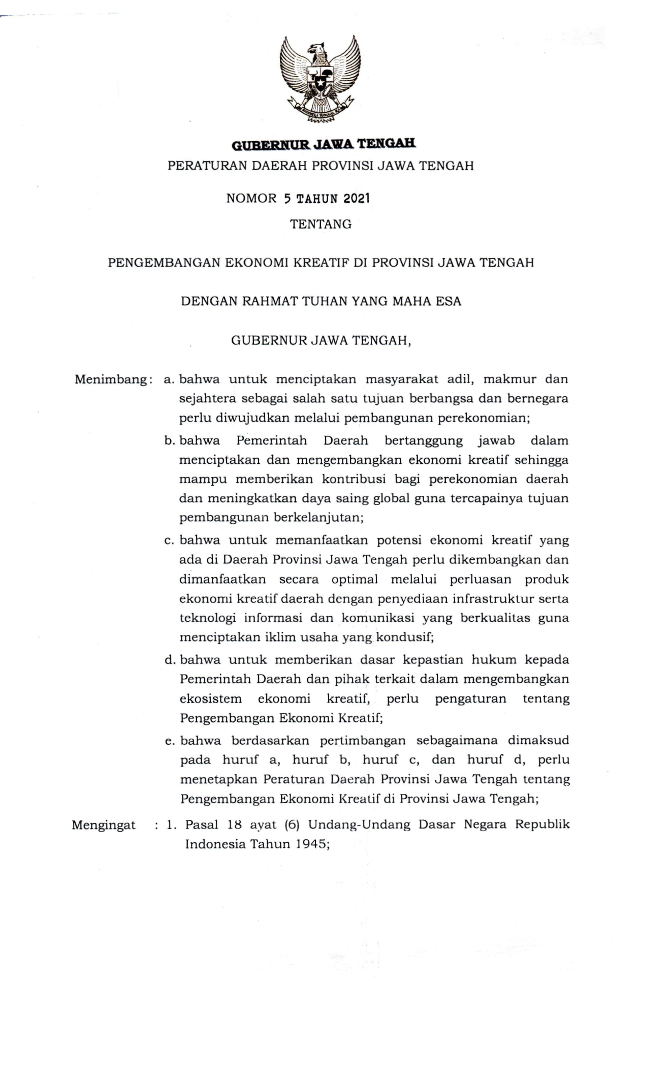 PERDA Nomor 5 Tahun 2021 | Peraturan Daerah Nomor 5 Tahun 2021 tentang PENGEMBANGAN EKONOMI KREATIF DI PROVINS! JAWA TENGAH