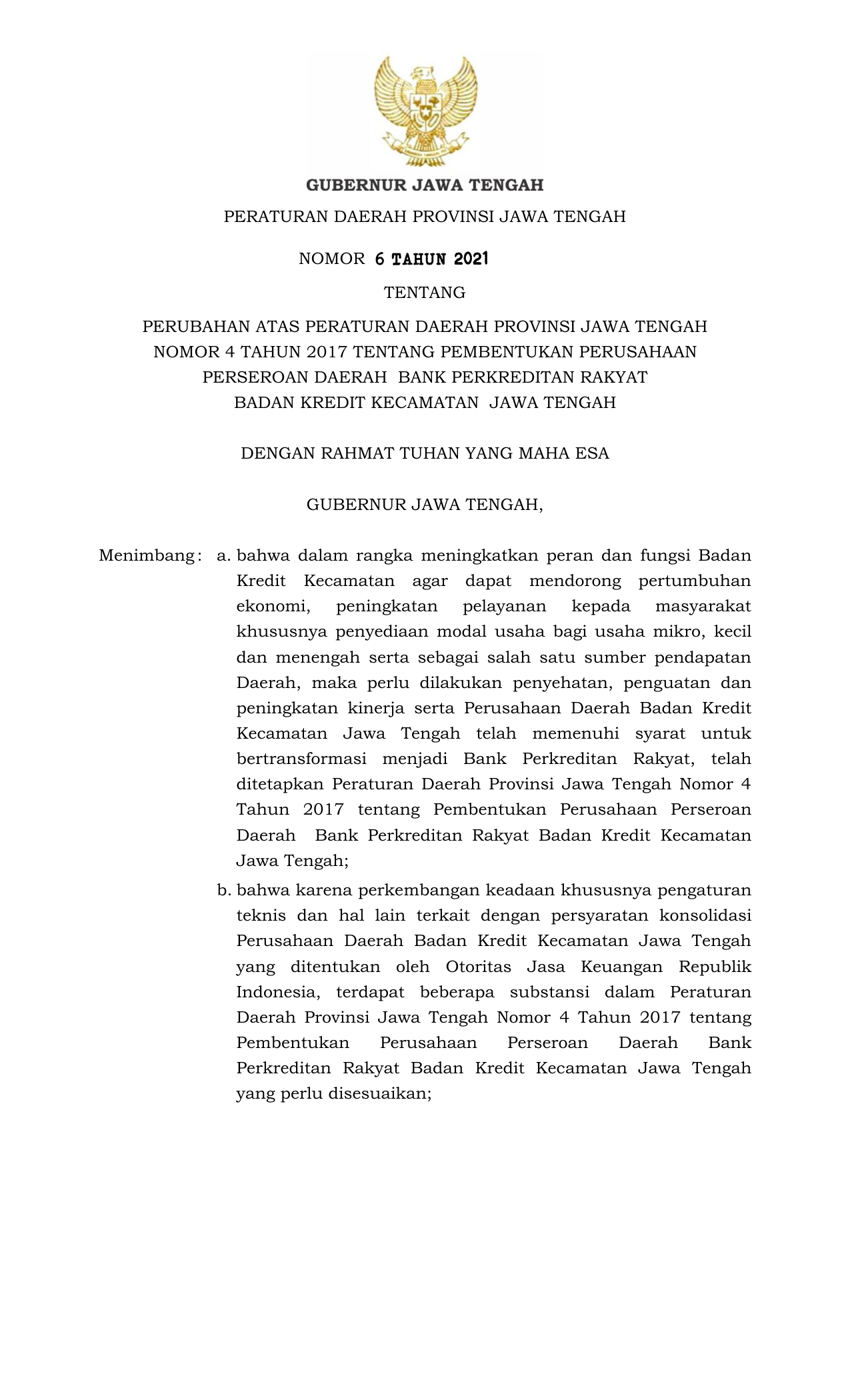 PERDA Nomor 6 Tahun 2021 | Peraturan Daerah Nomor 6 Tahun 2021 tentang PERUBAHAN ATAS PERATURAN DAERAH PROVINSI JAWA TENGAH NOMOR 4 TAHUN 2017 TENTANG PEMBENTUKAN PERUSAHAAN PERSEROAN DAERAH BANK PERKREDITAN RAKYAT BADAN KREDIT KECAMATAN JAWA TENGAH