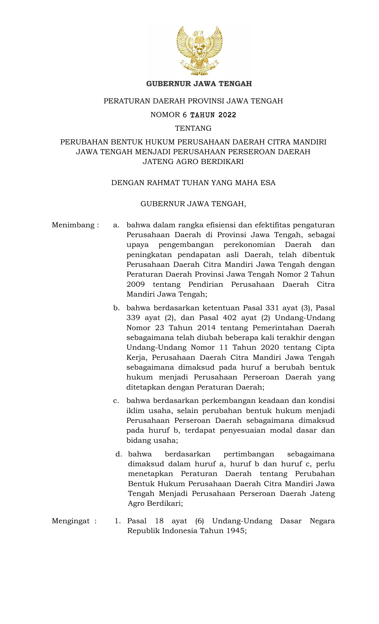 PERDA Nomor 6 Tahun 2022 | Peraturan Daerah Nomor 6 Tahun 2022 tentang PERUBAHAN BENTUK HUKUM PERUSAHAAN DAERAH CITRA MANDIRI JAWA TENGAH MENJADI PERUSAHAAN PERSEROAN DAERAH JATENG AGRO BERDIKARI