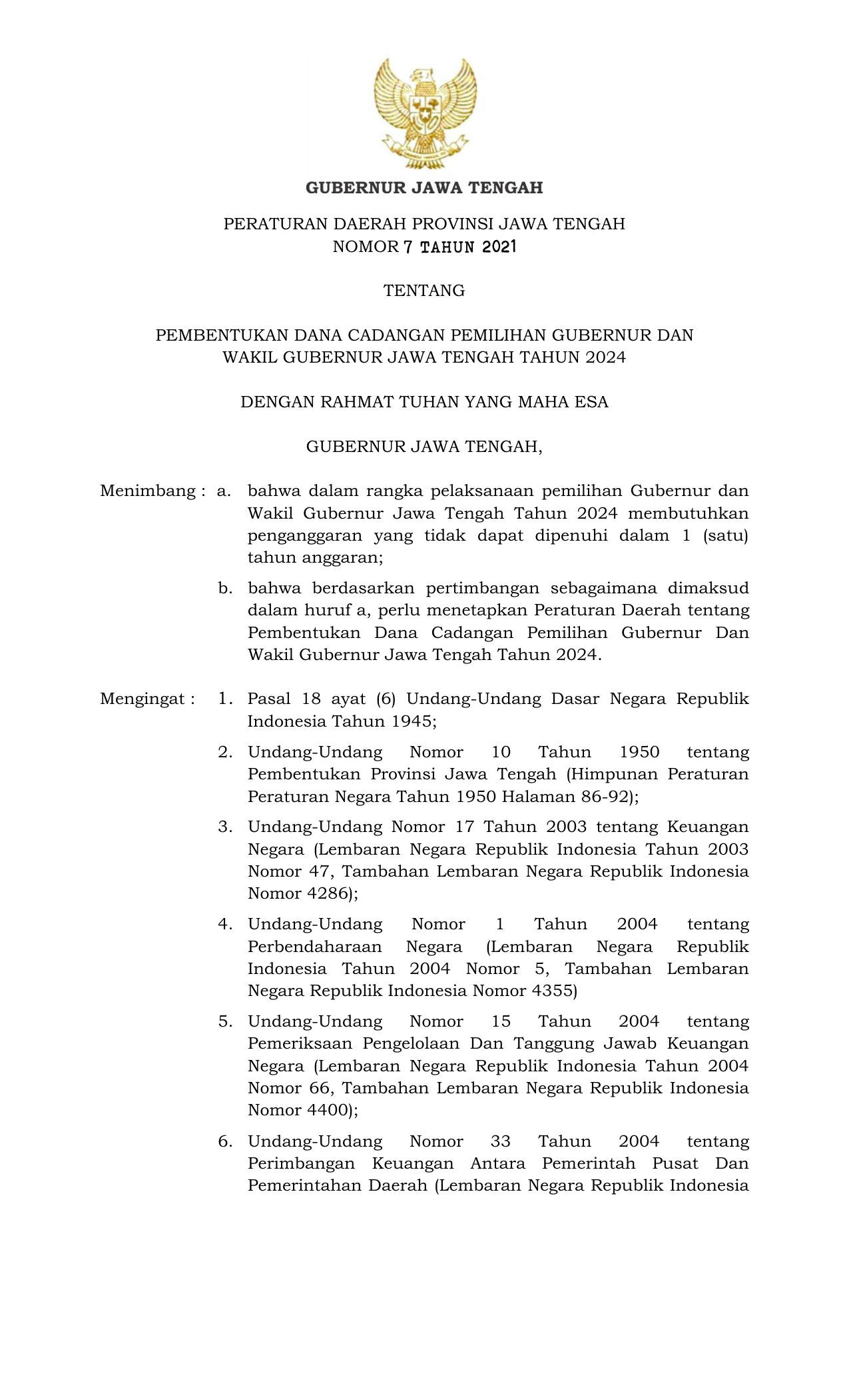 PERDA Nomor 7 Tahun 2021 | Peraturan Daerah Nomor 7 Tahun 2021 tentang PEMBENTUKAN DANA CADANGAN PEMILIHAN GUBERNUR DAN WAKIL GUBERNUR JAWA TENGAH TAHUN 2024