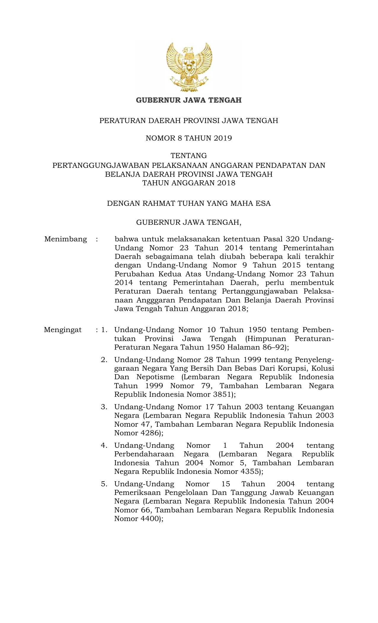 PERDA Nomor 8 Tahun 2019 | Peraturan Daerah Nomor 8 Tahun 2019 tentang PERTANGGUNGJAWABAN PELAKSANAAN ANGGARAN PENDAPATAN DANBELANJA DAERAH PROVINSI JAWA TENGAH TAHUN ANGGARAN 2018