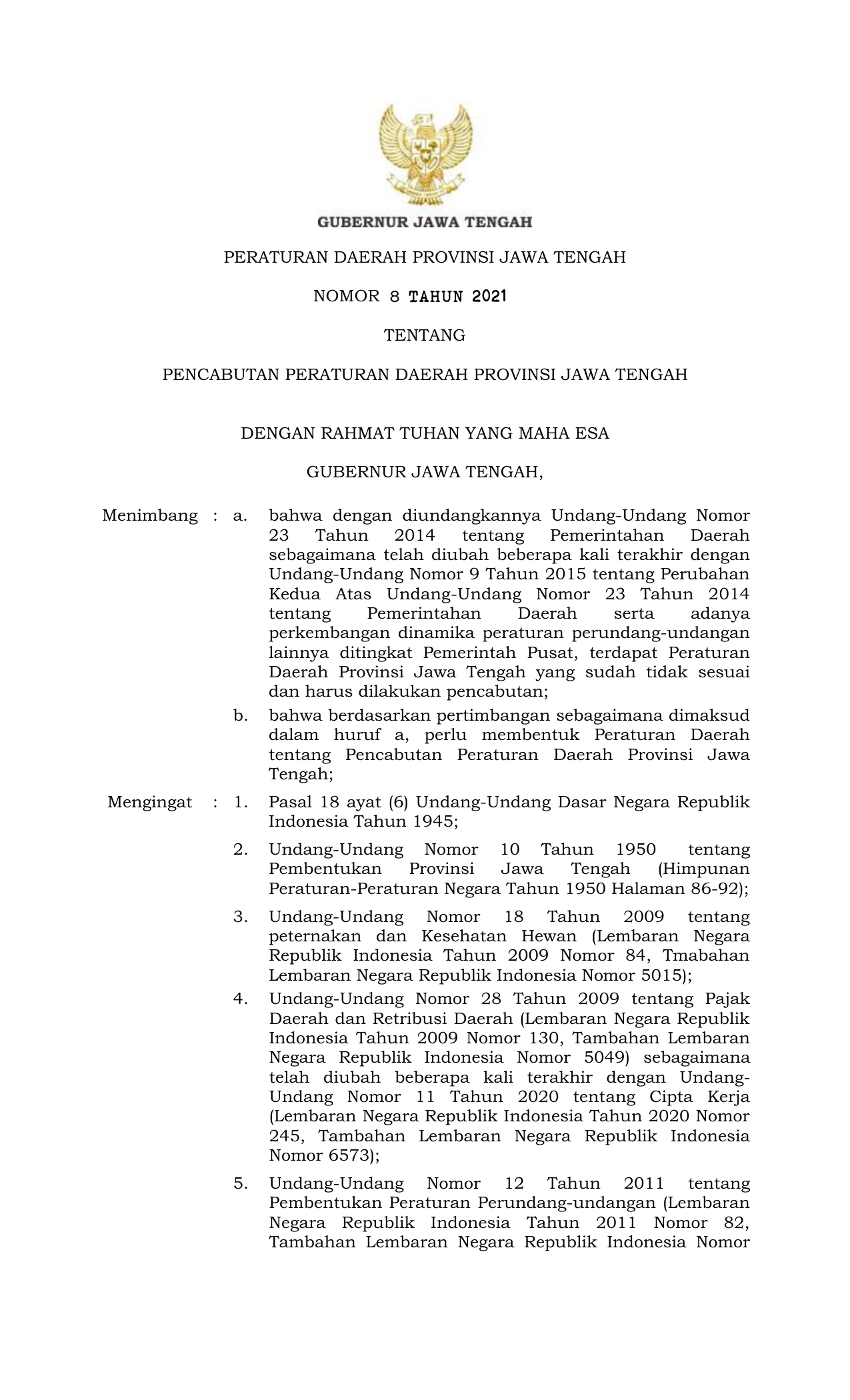 PERDA Nomor 8 Tahun 2021 | Peraturan Daerah Nomor 8 Tahun 2021 tentang PENCABUTAN PERATURAN DAERAH PROVINSI JAWA TENGAH