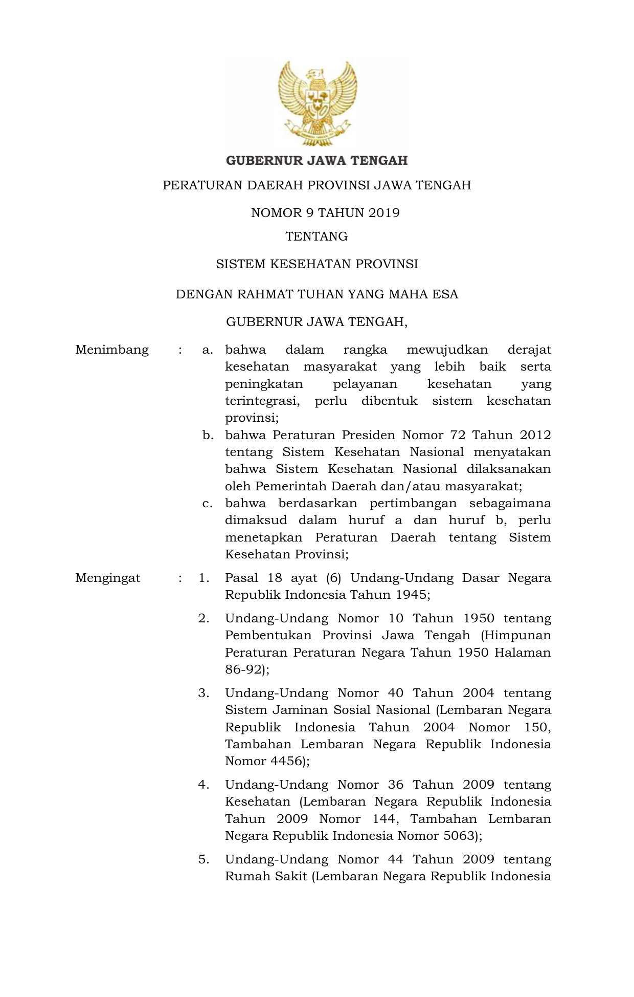 PERDA Nomor 9 Tahun 2019 | Peraturan Daerah Nomor 9 Tahun 2019 tentang SISTEM KESEHATAN PROVINSI