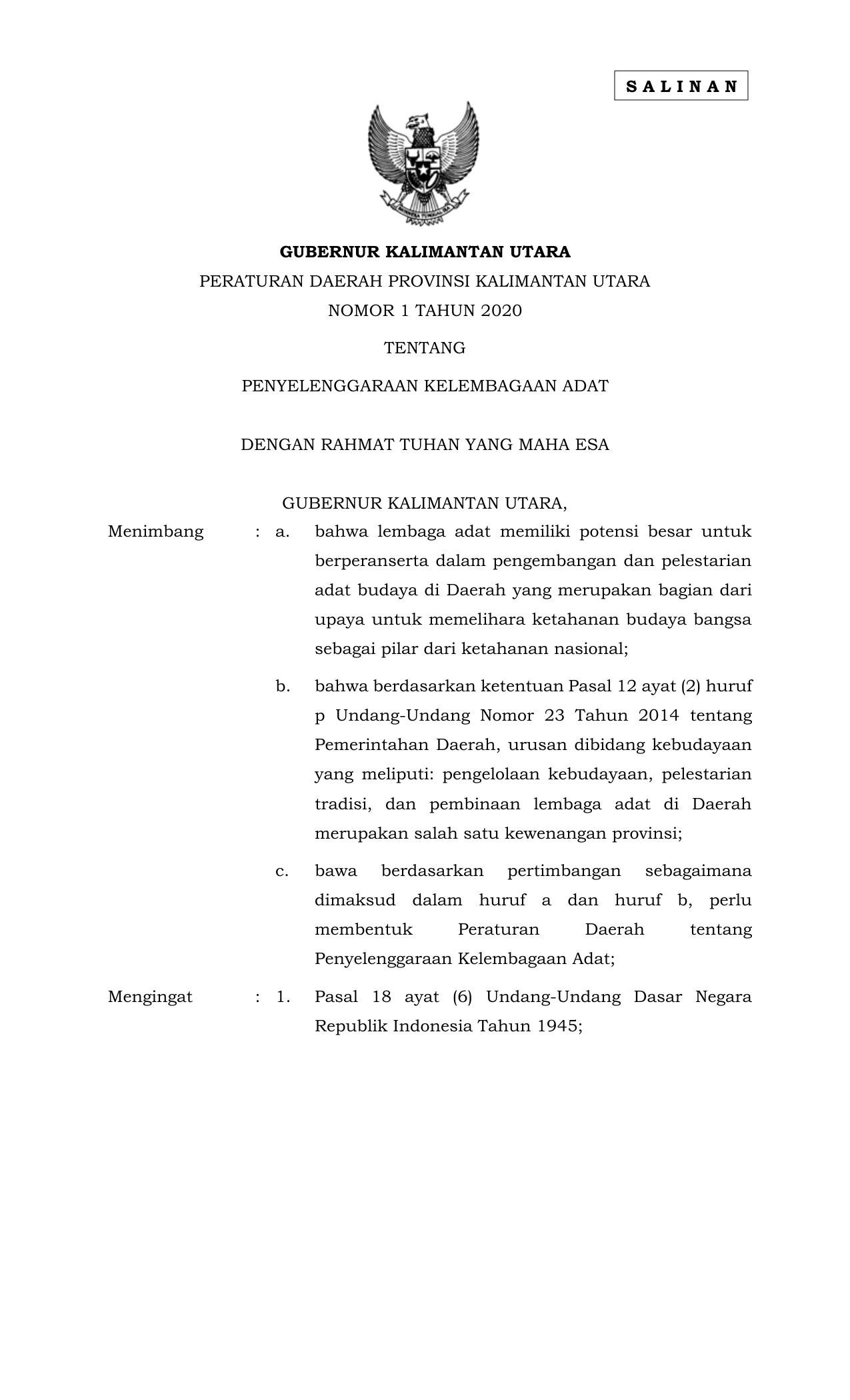 PERDA Nomor 1 Tahun 2020 | Peraturan Daerah Nomor 1 Tahun 2020 tentang PENYELENGGARAAN KELEMBAGAAN ADAT