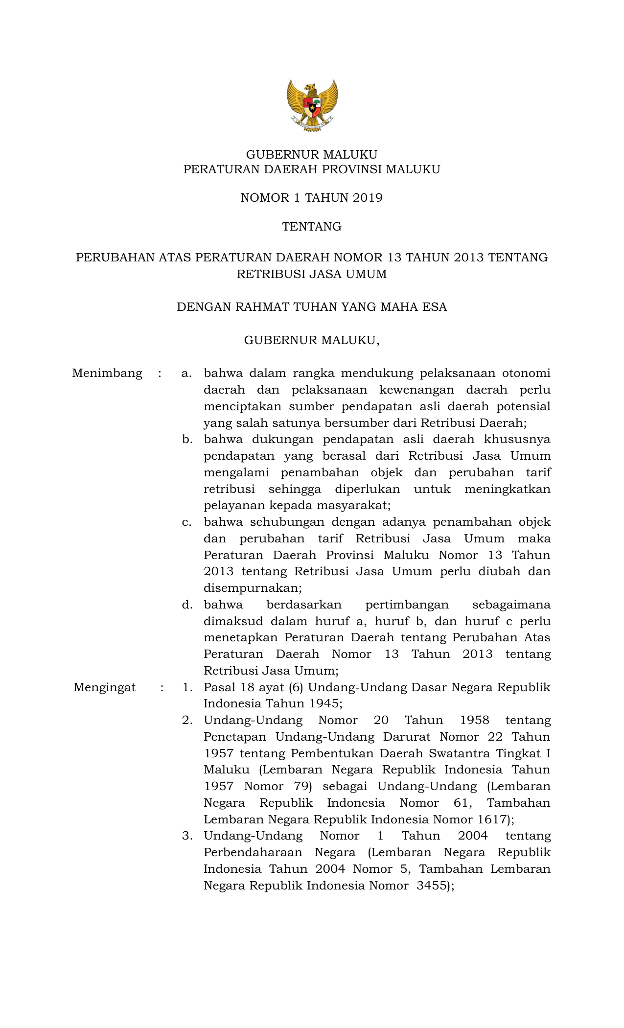 PERDA Nomor 1 Tahun 2019 | Peraturan Daerah Nomor 1 Tahun 2019 tentang PERUBAHAN ATAS PERATURAN DAERAH NOMOR 13 TAHUN 2013 TENTANG RETRIBUSI JASA UMUM