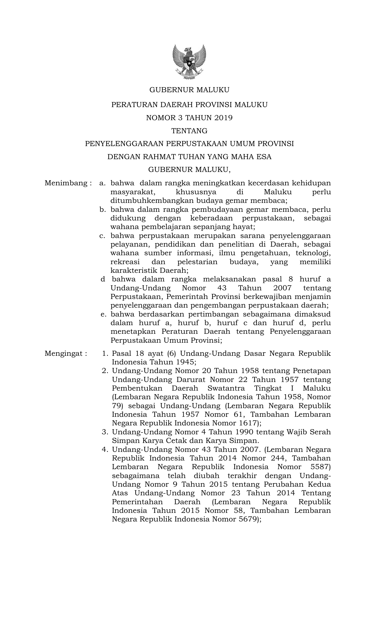 PERDA Nomor 3 Tahun 2019 | Peraturan Daerah Nomor 3 Tahun 2019 tentang PENYELENGGARAAN PERPUSTAKAAN UMUM PROVINSI