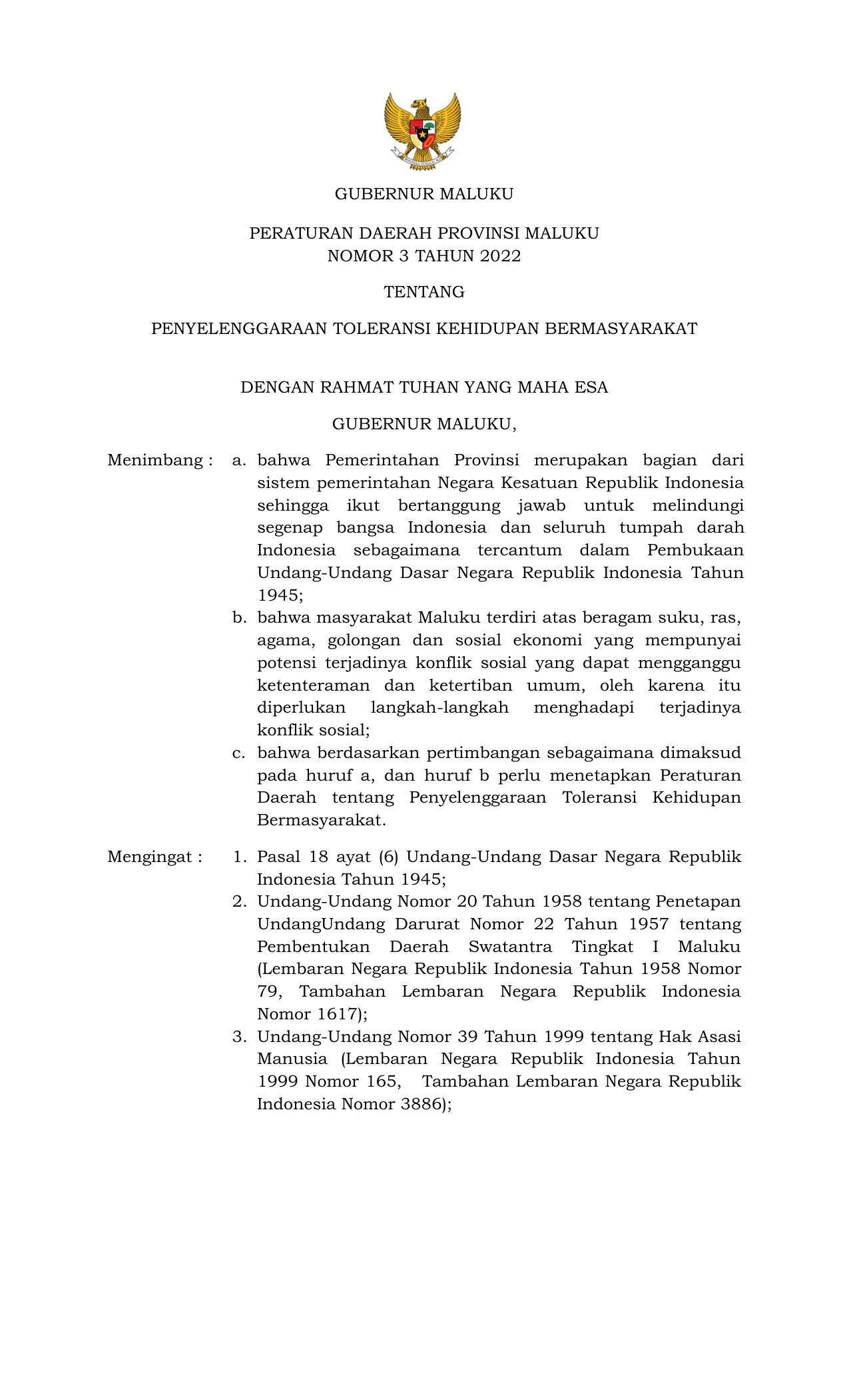 PERDA Nomor 3 Tahun 2022 | Peraturan Daerah Nomor 3 Tahun 2022 tentang PENYELENGGARAAN TOLERANSI KEHIDUPAN BERMASYARAKAT