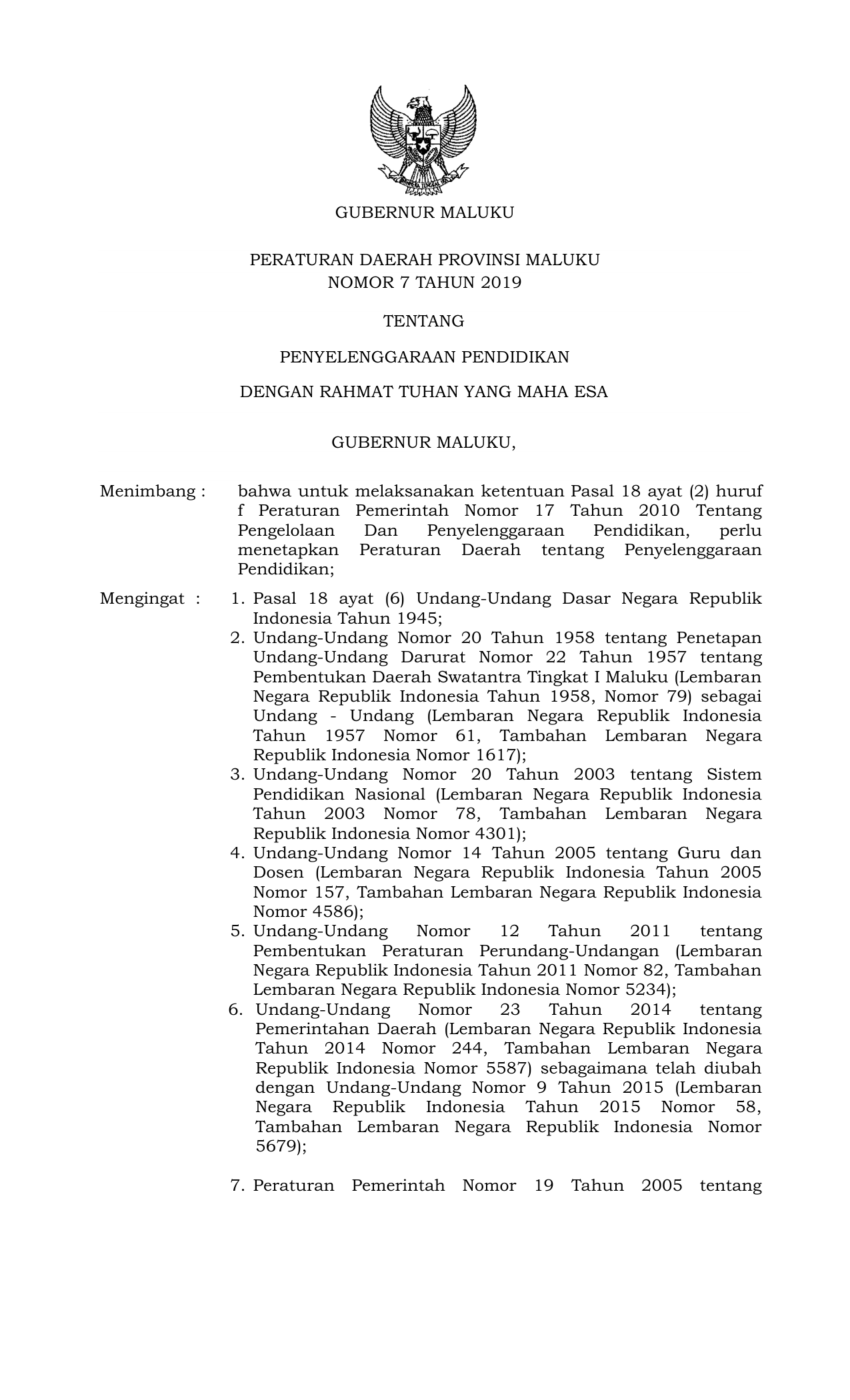 PERDA Nomor 7 Tahun 2019 | Peraturan Daerah Nomor 7 Tahun 2019 tentang PENYELENGGARAAN PENDIDIKAN