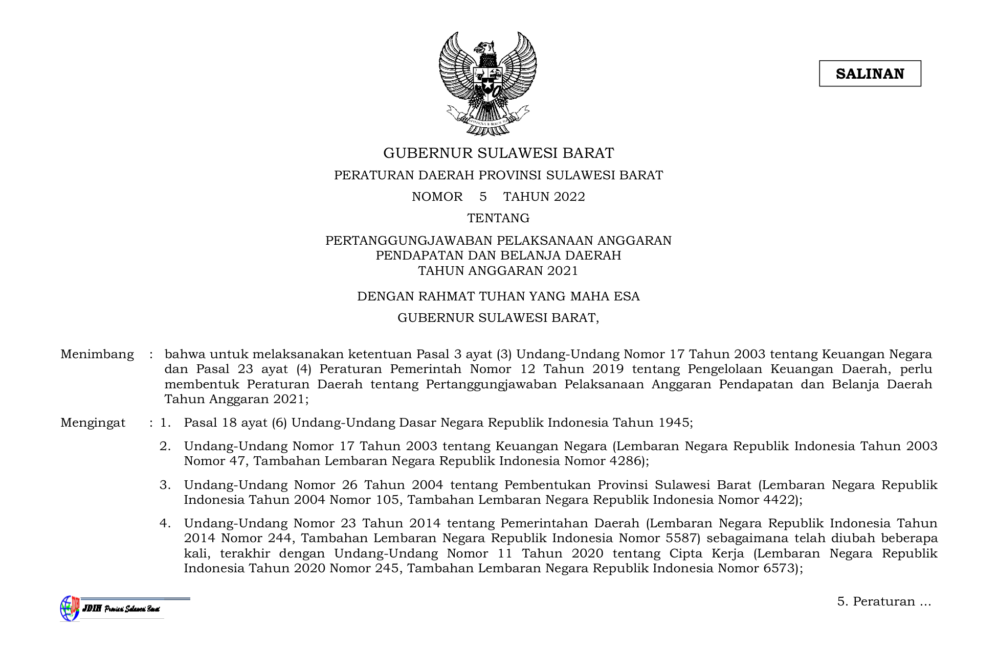 PERDA Nomor 5 Tahun 2022 | Peraturan Daerah Nomor 5 Tahun 2022 tentang PERTANGGUNGJAWABAN PELAKSANAAN ANGGARAN PENDAPATAN DAN BELANJA DAERAH TAHUN ANGGARAN 2021