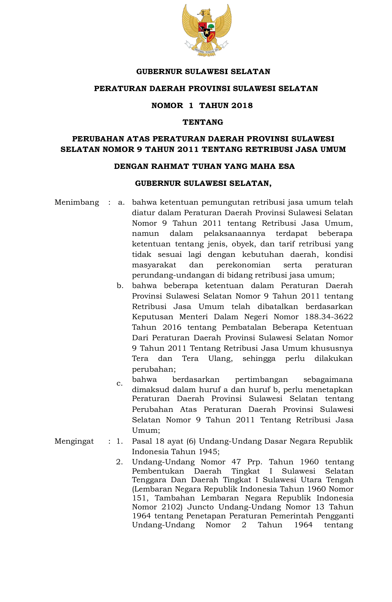 PERDA Nomor 1 Tahun 2018 | Peraturan Daerah Nomor 1 Tahun 2018 tentang Perubahan Atas Peraturan Daerah Provinsi Sulawesi Selatan Nomor 9 Tahun 2011 tentang Retribusi Jasa Umum