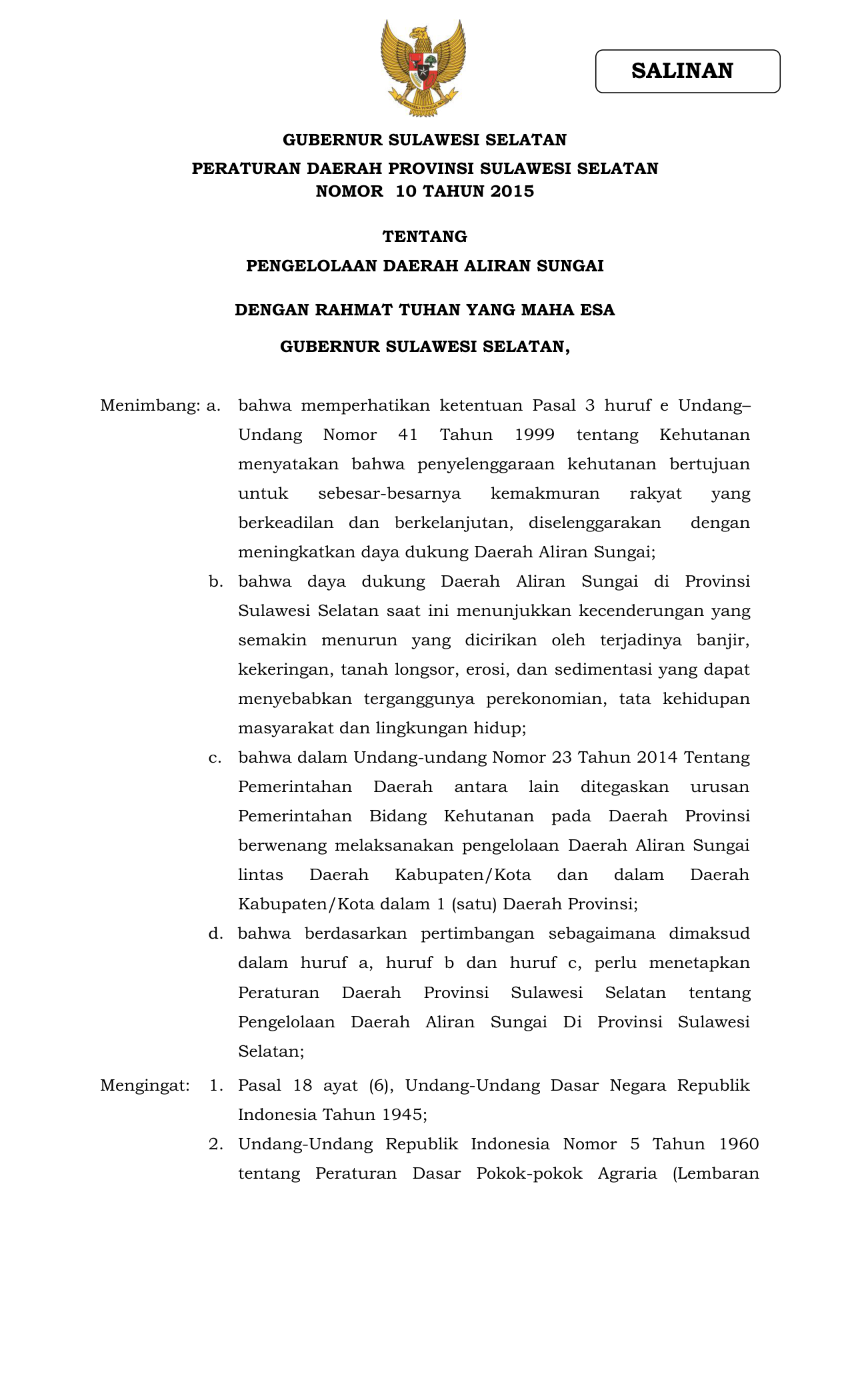 PERDA Nomor 10 Tahun 2015 | Peraturan Daerah Nomor 10 Tahun 2015 tentang Pengelolaan Daerah Aliran Sungai