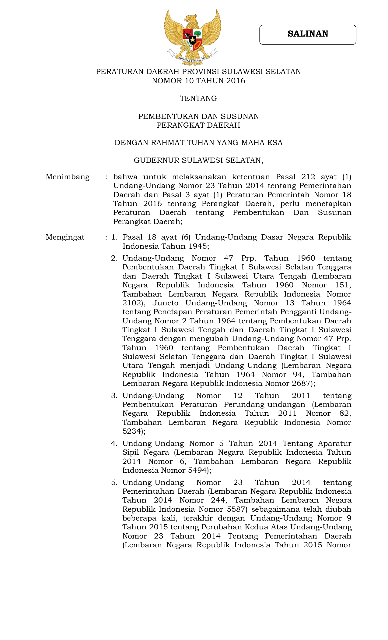 PERDA Nomor 10 Tahun 2016 | Peraturan Daerah Nomor 10 Tahun 2016 tentang Pembentukan Dan Susunan Perangkat Daerah