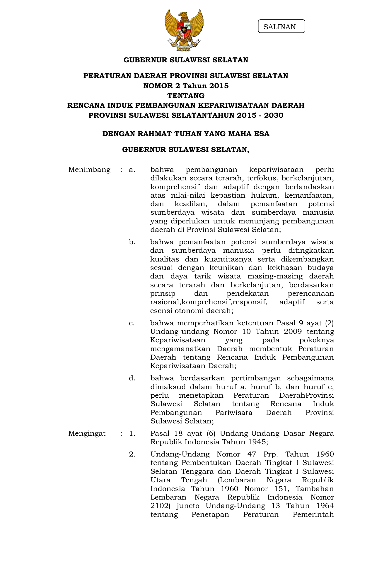 PERDA Nomor 2 Tahun 2015 | Peraturan Daerah Nomor 2 Tahun 2015 tentang Rencana Induk Pembangunan Kepariwisataan Daerah Provinisi Sulawesi Selatan Tahun 2015 - 2030