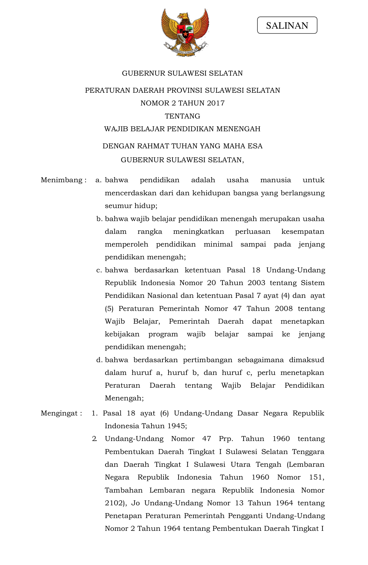 PERDA Nomor 2 Tahun 2017 | Peraturan Daerah Nomor 2 Tahun 2017 tentang Wajib Belajar Pendidikan Menengah