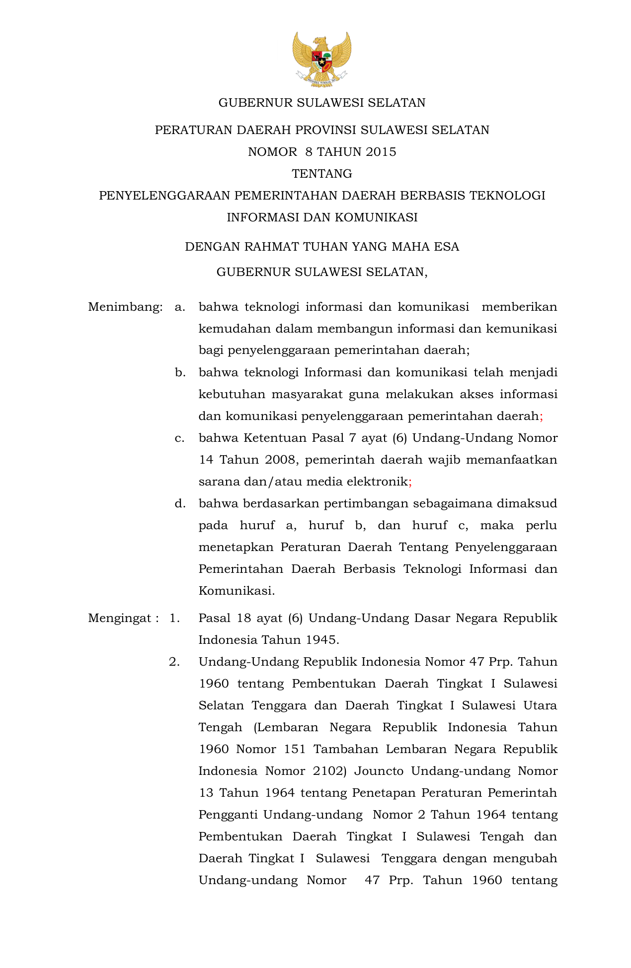 PERDA Nomor 8 Tahun 2015 | Peraturan Daerah Nomor 8 Tahun 2015 tentang Penyelenggaraan Pemerintahan Berbasis Teknologi Informasi Dan Komunikasi