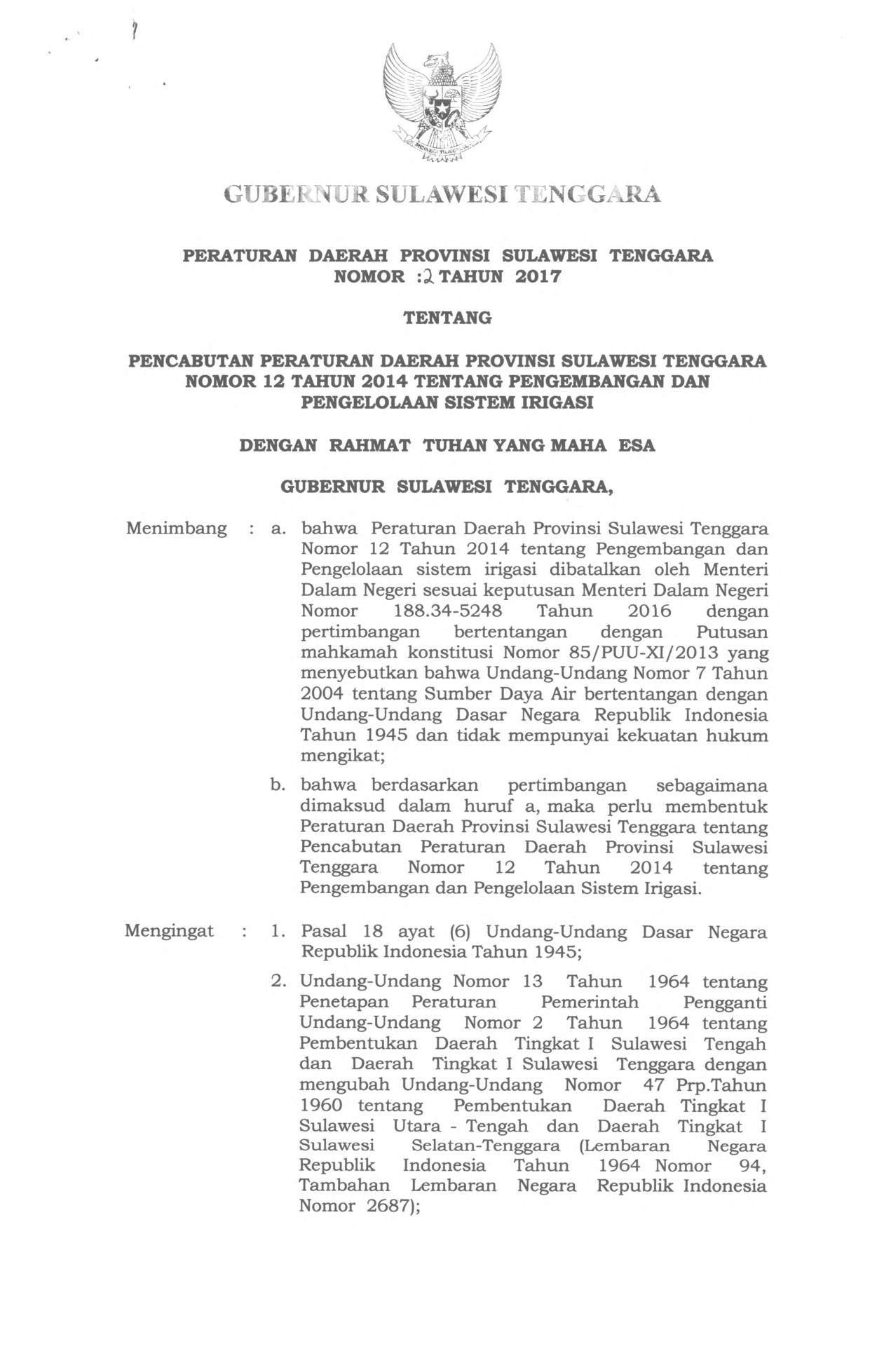 PERDA Nomor 2 Tahun 2017 | Peraturan Daerah Nomor 2 Tahun 2017 tentang PENCABUTAN PERATURAN DAERAH PROVINSI SULAWESI TENGGARA NOMOR 12 TAHUN 2014 TENTANG PENGEMBANGAN DAN PENGELOLAAN SISTEM IRIGASI