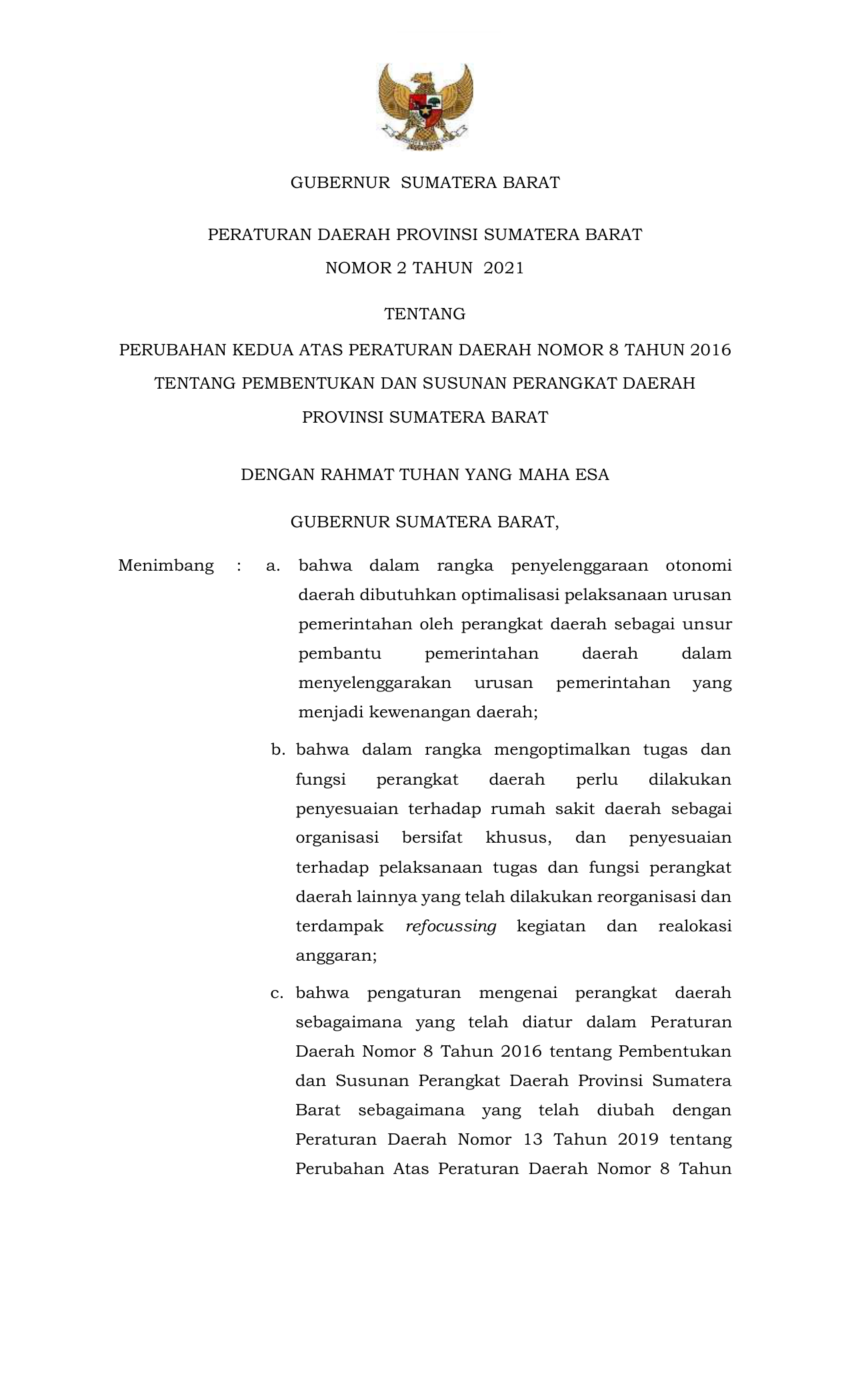 PERDA Nomor 2 Tahun 2021 | Peraturan Daerah Nomor 2 Tahun 2021 tentang PERUBAHAN KEDUA ATAS PERATURAN DAERAH NOMOR 8 TAHUN 2016 TENTANG PEMBENTUKAN DAN SUSUNAN PERANGKAT DAERAH PROVINSI SUMATERA BARAT