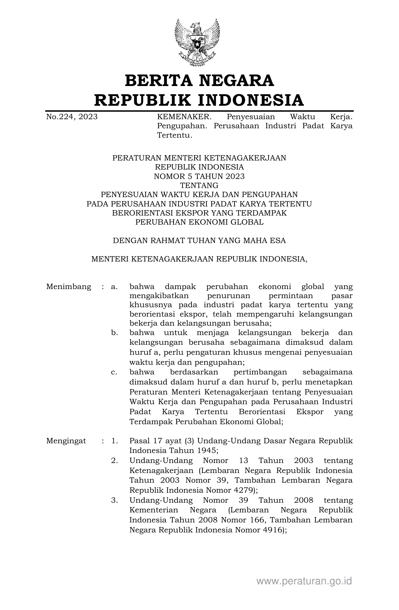 PERMEN Nomor 5 Tahun 2023 | Peraturan Menteri Nomor 5 Tahun 2023 tentang PENYESUAIAN WAKTU KERJA DAN PENGUPAHAN PADA PERUSAHAAN INDUSTRI PADAT KARYA TERTENTU BERORIENTASI EKSPOR YANG TERDAMPAK PERUBAHAN EKONOMI GLOBAL