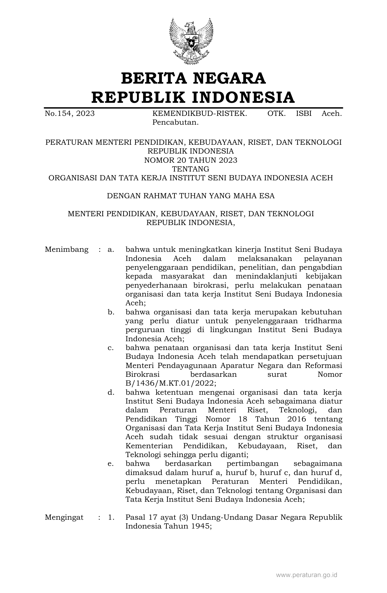 PERMEN Nomor 20 Tahun 2023 | Peraturan Menteri Nomor 20 Tahun 2023 tentang ORGANISASI DAN TATA KERJA INSTITUT SENI BUDAYA INDONESIA ACEH