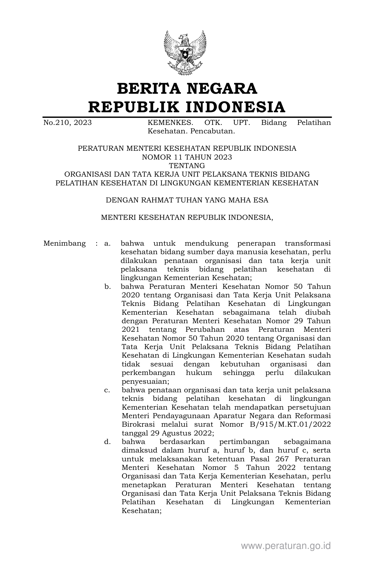 PERMEN Nomor 11 Tahun 2023 | Peraturan Menteri Nomor 11 Tahun 2023 tentang ORGANISASI DAN TATA KERJA UNIT PELAKSANA TEKNIS BIDANG PELATIHAN KESEHATAN DI LINGKUNGAN KEMENTERIAN KESEHATAN