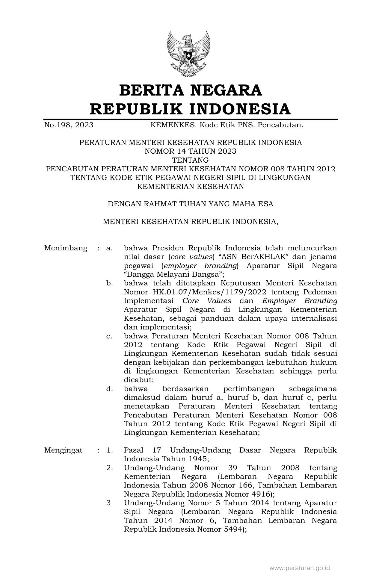 PERMEN Nomor 14 Tahun 2023 | Peraturan Menteri Nomor 14 Tahun 2023 tentang PENCABUTAN PERATURAN MENTERI KESEHATAN NOMOR 008 TAHUN 2012 TENTANG KODE ETIK PEGAWAI NEGERI SIPIL DI LINGKUNGAN KEMENTERIAN KESEHATAN