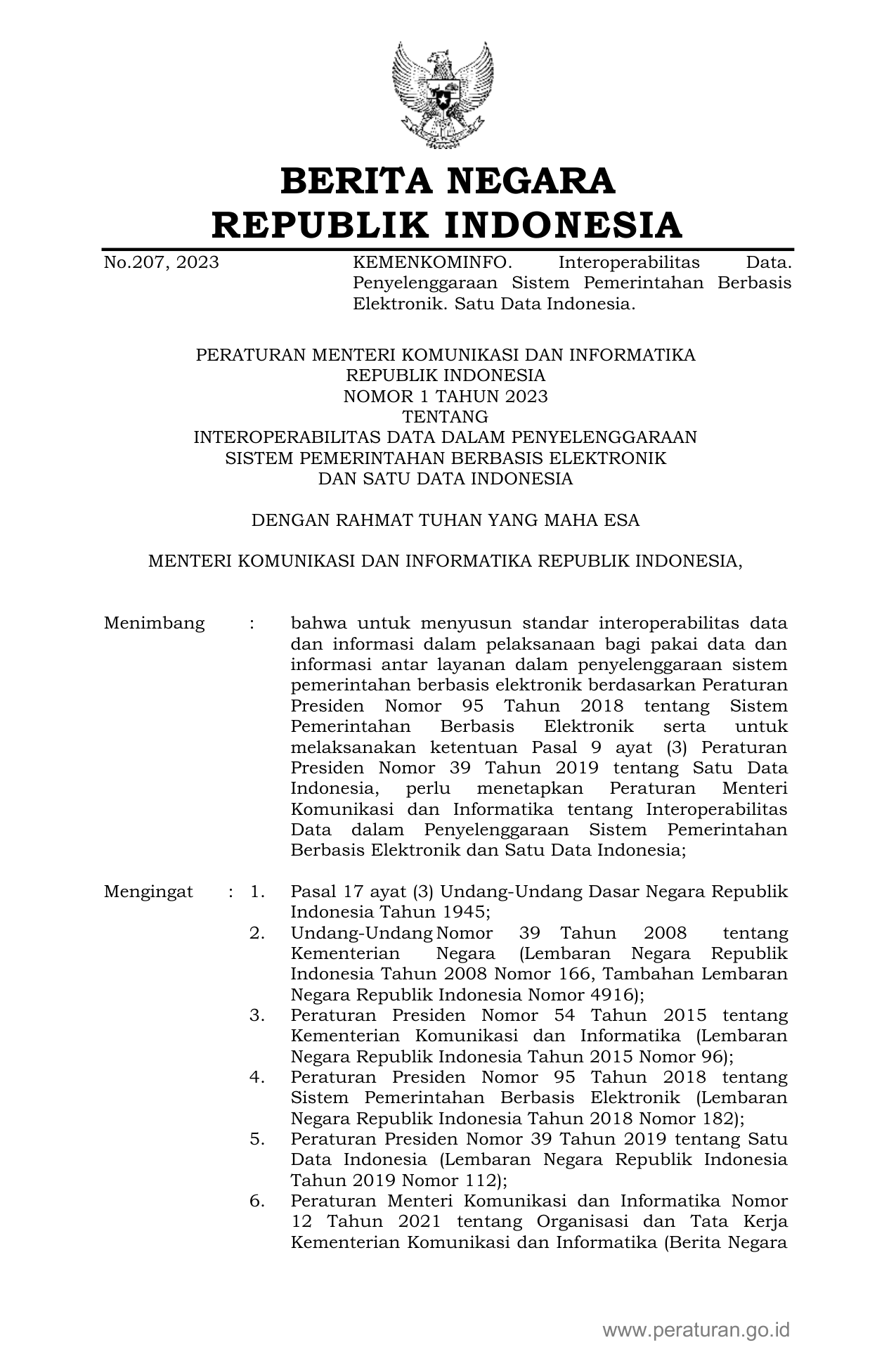 PERMEN Nomor 1 Tahun 2023 | Peraturan Menteri Nomor 1 Tahun 2023 tentang INTEROPERABILITAS DATA DALAM PENYELENGGARAAN SISTEM PEMERINTAHAN BERBASIS ELEKTRONIK DAN SATU DATA INDONESIA