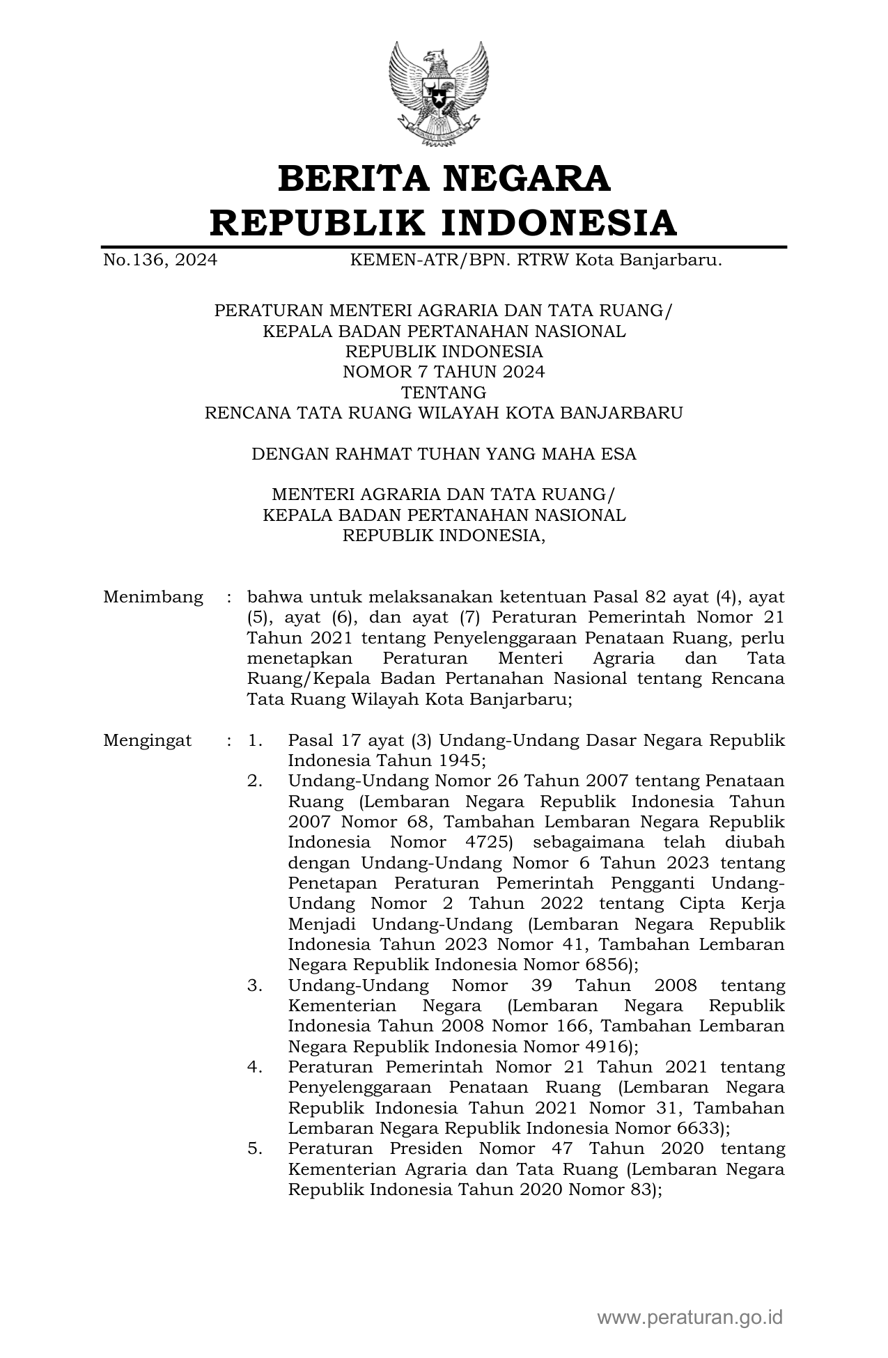 PERMEN Nomor 7 Tahun 2024 | Peraturan Menteri Nomor 7 Tahun 2024 tentang RENCANA TATA RUANG WILAYAH KOTA BANJARBARU