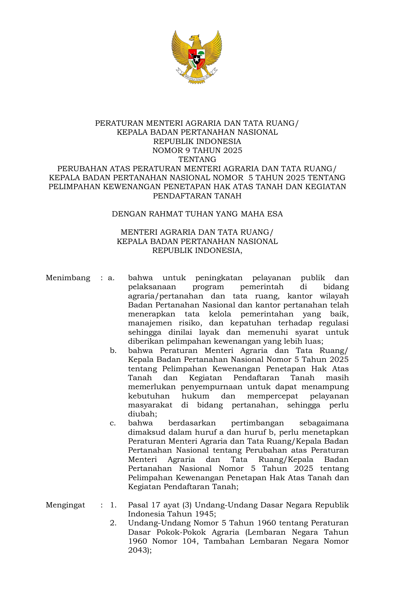 PERMEN Nomor 9 Tahun 2025 | Peraturan Menteri Nomor 9 Tahun 2025 tentang Perubahan atas Peraturan Menteri Agraria dan Tata Ruang Kepala Badan Pertanahan Nasional Nomor 5 Tahun 2025 tentang Pelimpahan Kewenangan Penetapan Hak Atas Tanah dan Kegiatan Pendaftaran Tanah