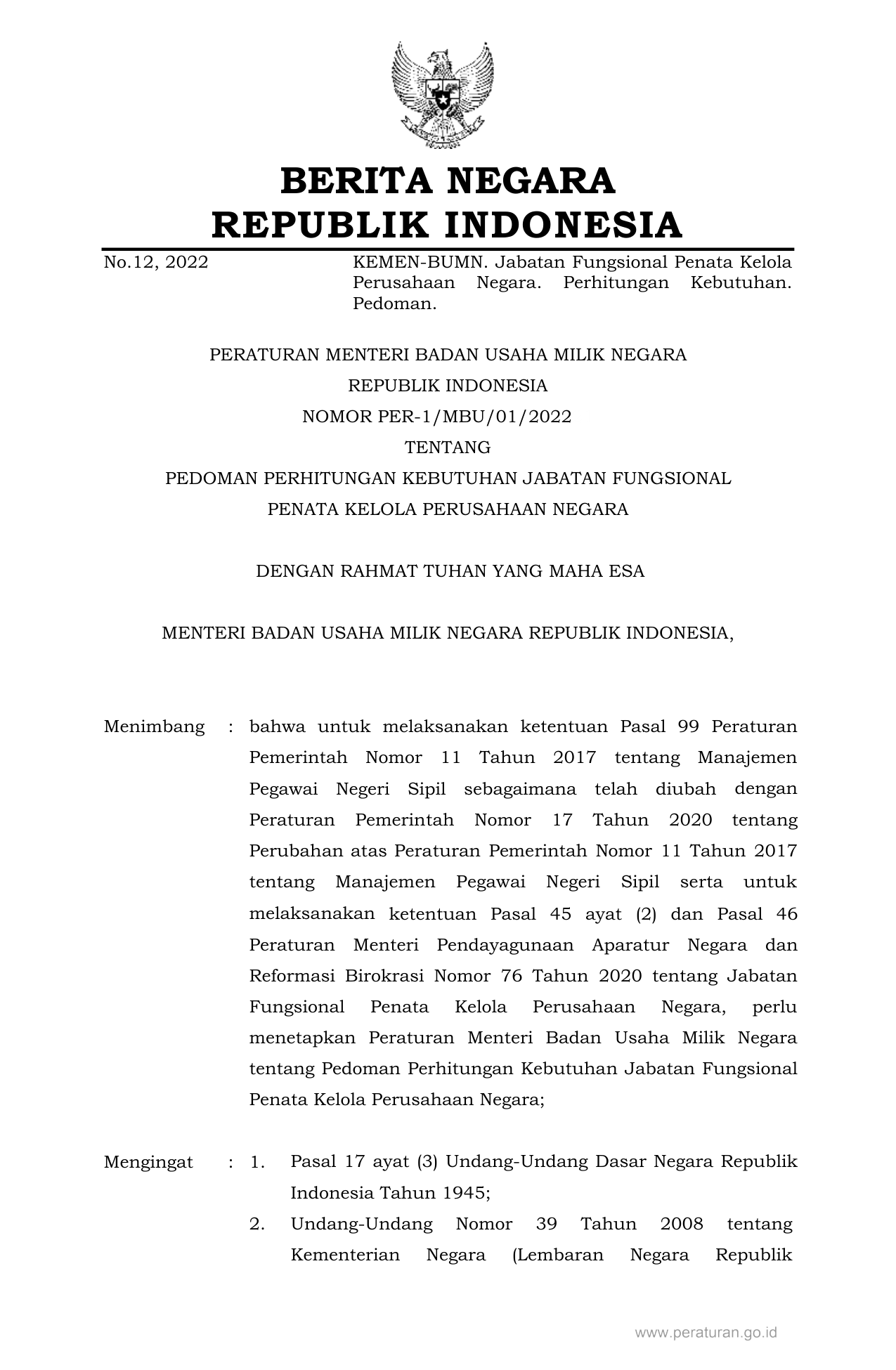 PERMEN Nomor per-1-mbu-01-2022 Tahun 2022 | Peraturan Menteri Nomor per-1-mbu-01-2022 Tahun 2022 tentang PEDOMAN PERHITUNGAN KEBUTUHAN JABATAN FUNGSIONAL PENATA KELOLA PERUSAHAAN NEGARA