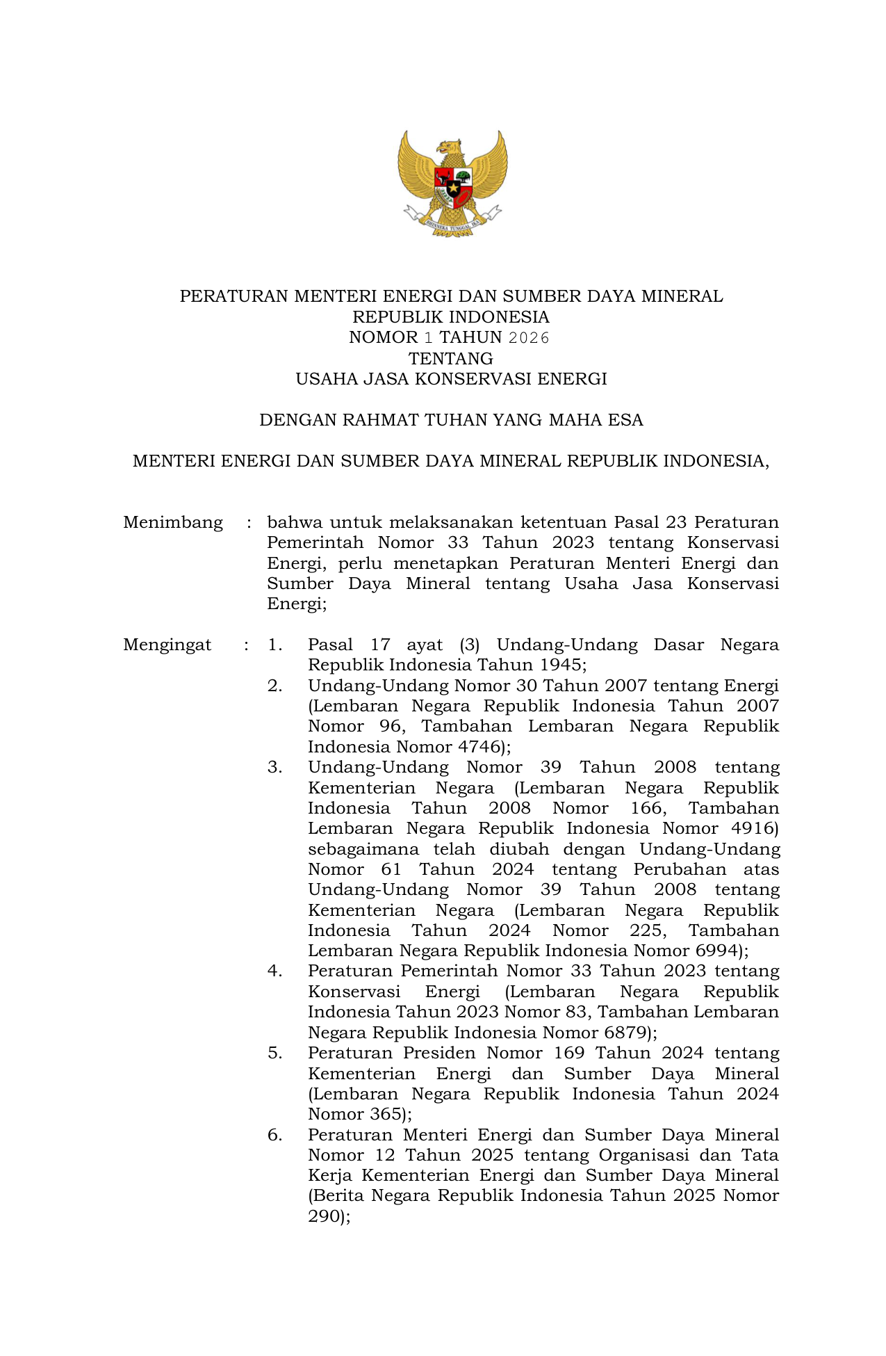 PERMEN Nomor 1 Tahun 2026 | Peraturan Menteri Nomor 1 Tahun 2026 tentang Usaha Jasa Konservasi Energi