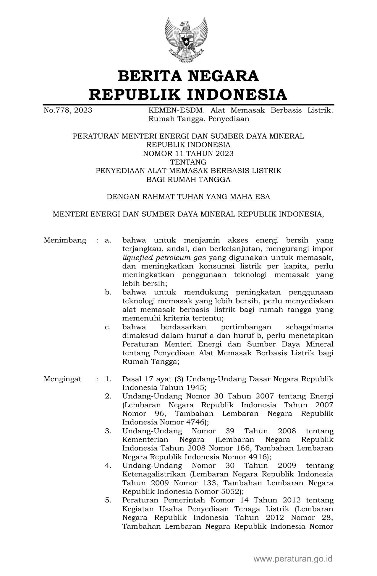 PERMEN Nomor 11 Tahun 2023 | Peraturan Menteri Nomor 11 Tahun 2023 tentang PENYEDIAAN ALAT MEMASAK BERBASIS LISTRIK BAGI RUMAH TANGGA