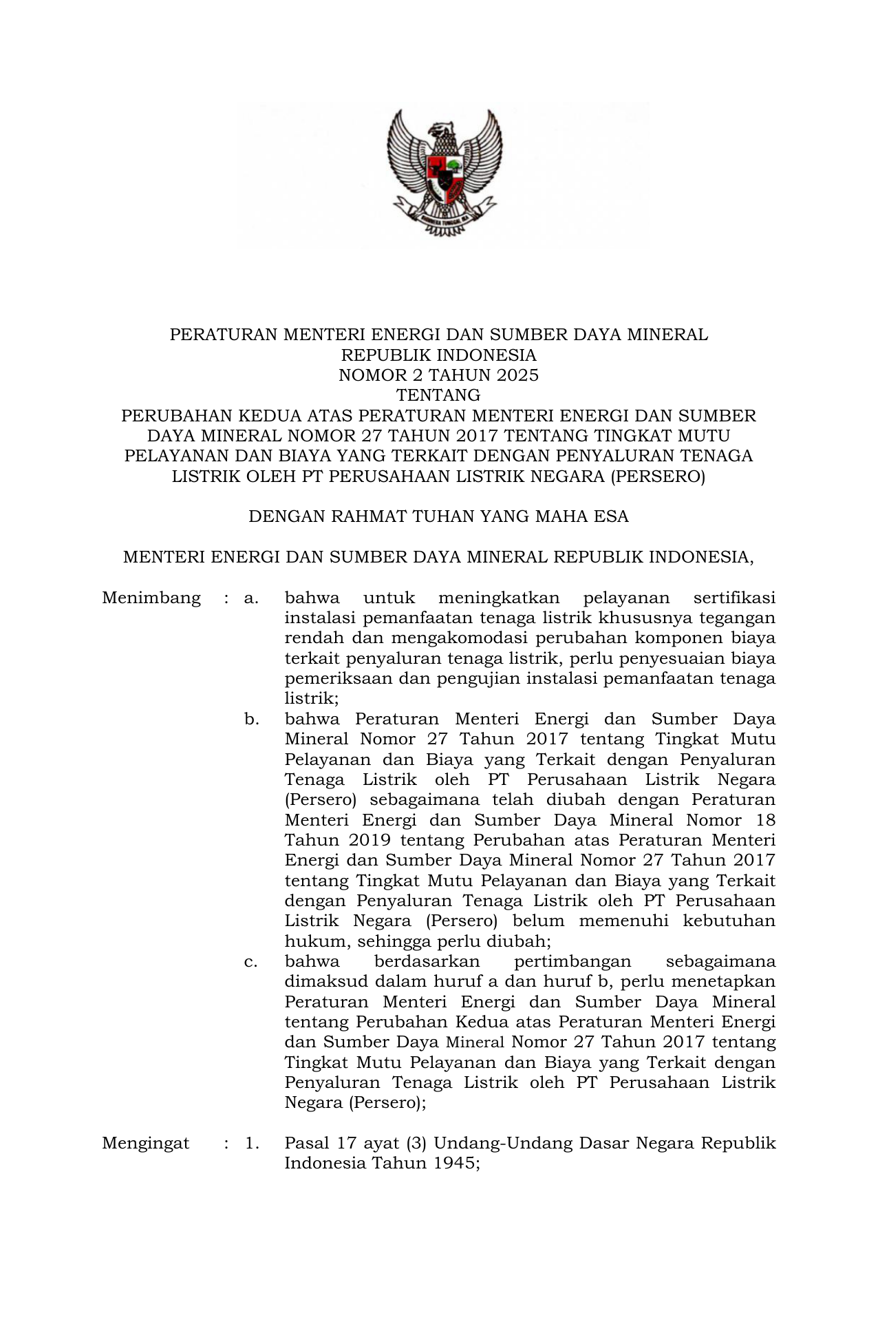 PERMEN Nomor 2 Tahun 2025 | Peraturan Menteri Nomor 2 Tahun 2025 tentang Perubahan Kedua atas Peraturan Menteri Energi dan Sumber Daya Mineral Nomor 27 Tahun 2017 tentang Tingkat Mutu Pelayanan dan Biaya yang Terkait dengan Penyaluran Tenaga Listrik oleh PT Perusahaan Listrik Negara Persero