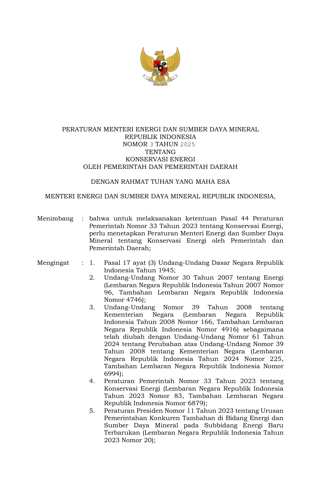 PERMEN Nomor 3 Tahun 2025 | Peraturan Menteri Nomor 3 Tahun 2025 tentang Konservasi Energi oleh Pemerintah dan Pemerintah Daerah