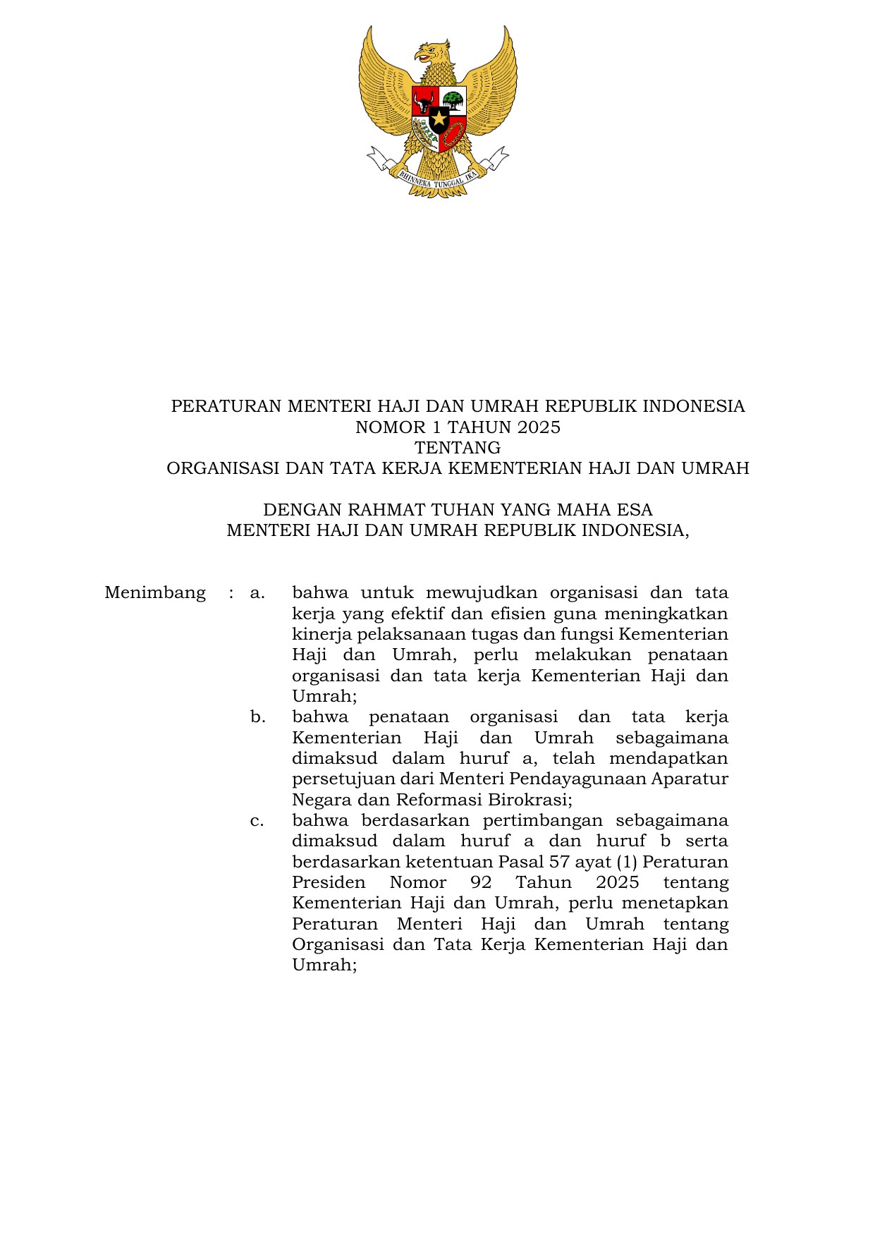 PERMEN Nomor 1 Tahun 2025 | Peraturan Menteri Nomor 1 Tahun 2025 tentang Organisasi dan Tata Kerja Kementerian Haji dan Umrah