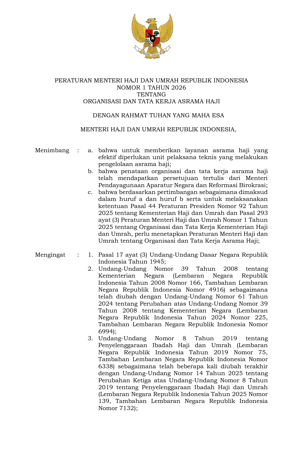 PERMEN Nomor 1 Tahun 2026 | Peraturan Menteri Nomor 1 Tahun 2026 tentang ORGANISASI DAN TATA KERJA ASRAMA HAJI