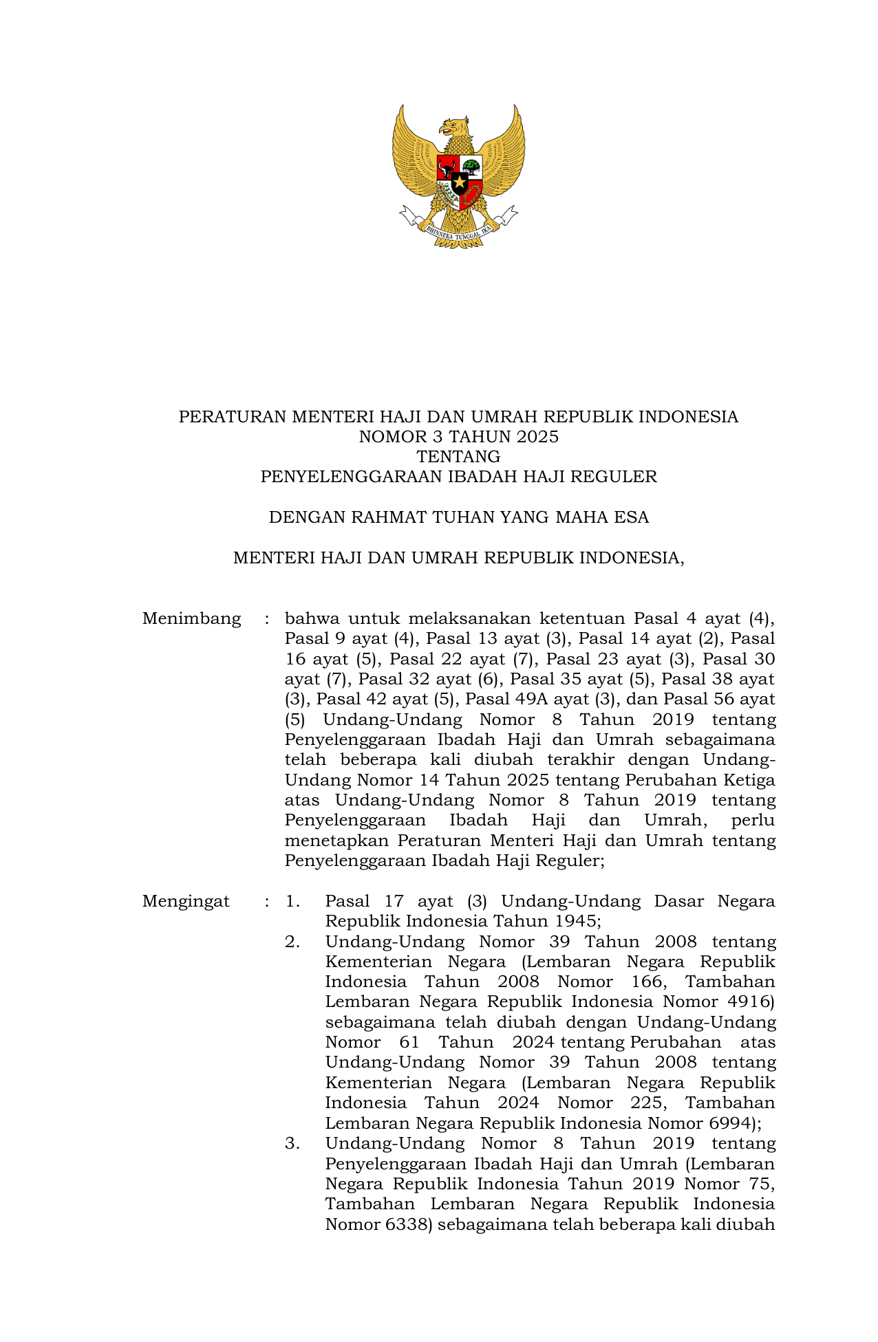 PERMEN Nomor 3 Tahun 2025 | Peraturan Menteri Nomor 3 Tahun 2025 tentang Penyelenggaraan Ibadah Haji Reguler