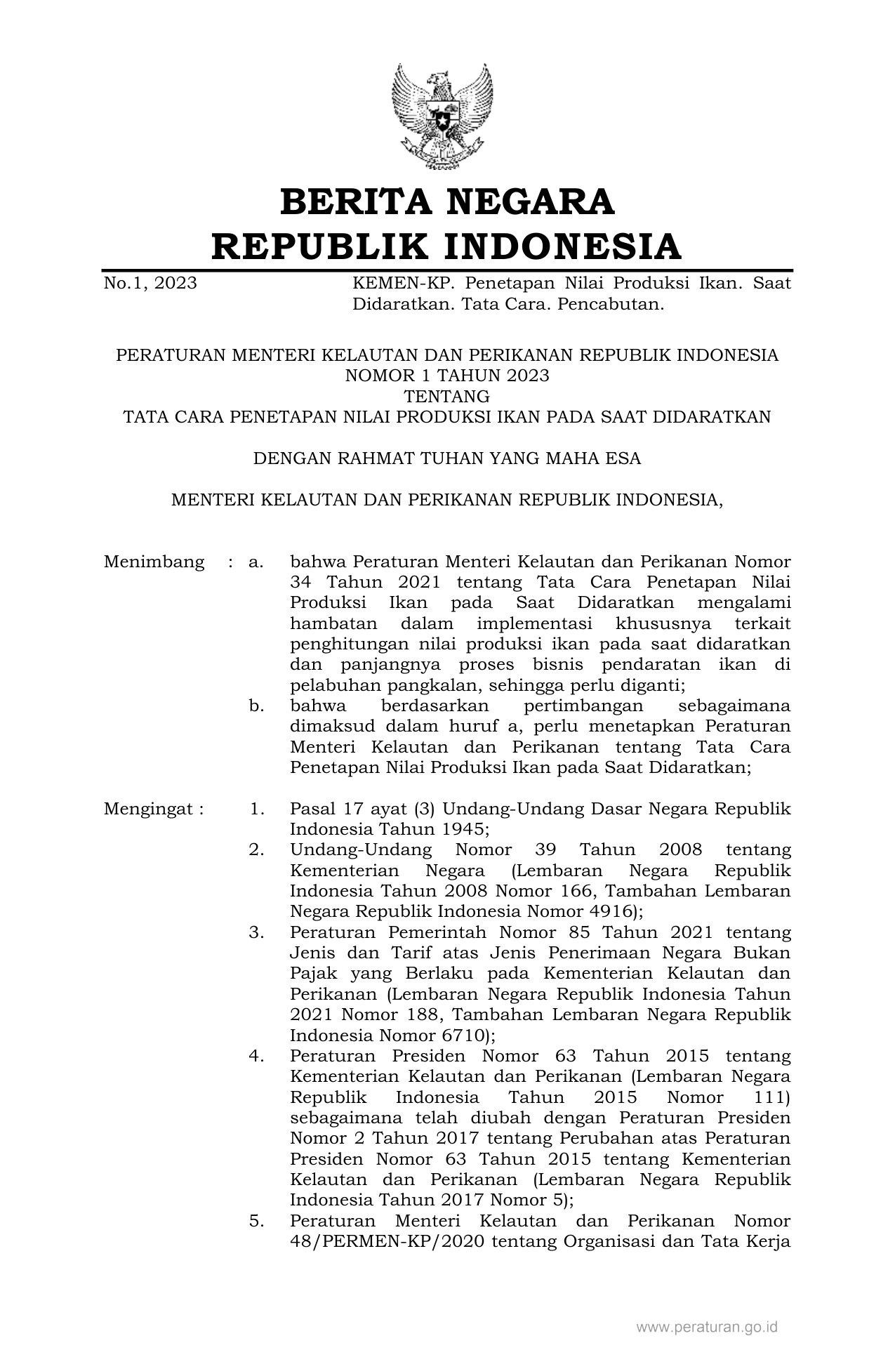 PERMEN Nomor 1 Tahun 2023 | Peraturan Menteri Nomor 1 Tahun 2023 tentang TATA CARA PENETAPAN NILAI PRODUKSI IKAN PADA SAAT DIDARATKAN