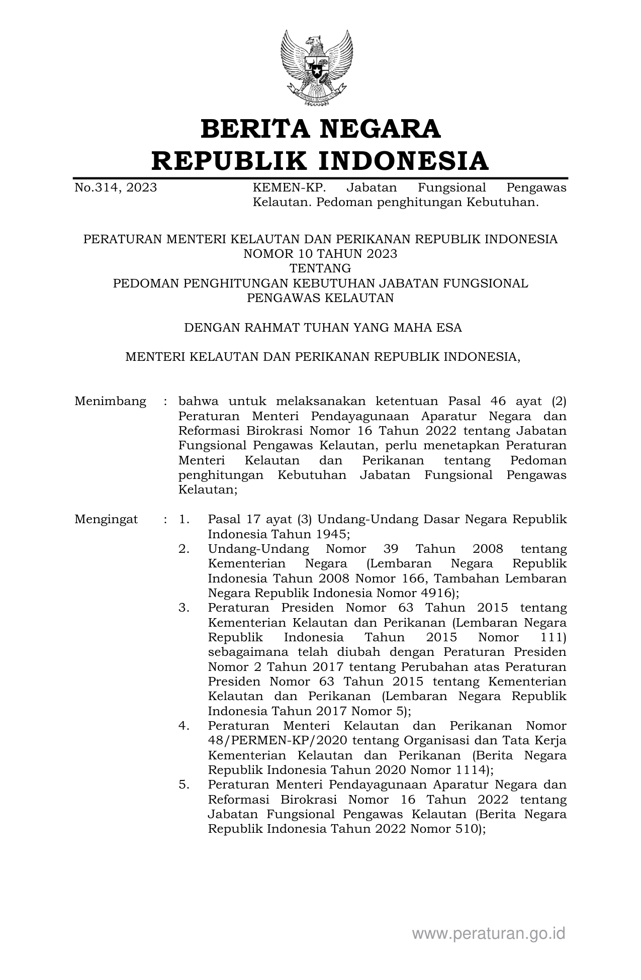PERMEN Nomor 10 Tahun 2023 | Peraturan Menteri Nomor 10 Tahun 2023 tentang PEDOMAN PENGHITUNGAN KEBUTUHAN JABATAN FUNGSIONAL PENGAWAS KELAUTAN