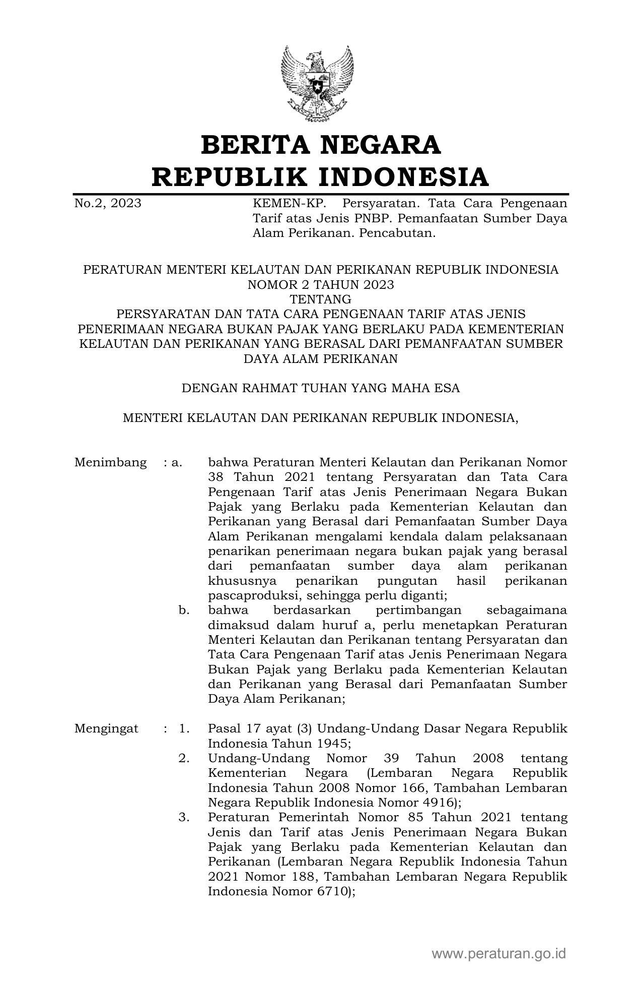 PERMEN Nomor 2 Tahun 2023 | Peraturan Menteri Nomor 2 Tahun 2023 tentang PERSYARATAN DAN TATA CARA PENGENAAN TARIF ATAS JENISPENERIMAAN NEGARA BUKAN PAJAK YANG BERLAKU PADA KEMENTERIAN KELAUTAN DAN PERIKANAN YANG BERASAL DARI PEMANFAATAN SUMBER DAYA ALAM PERIKANAN