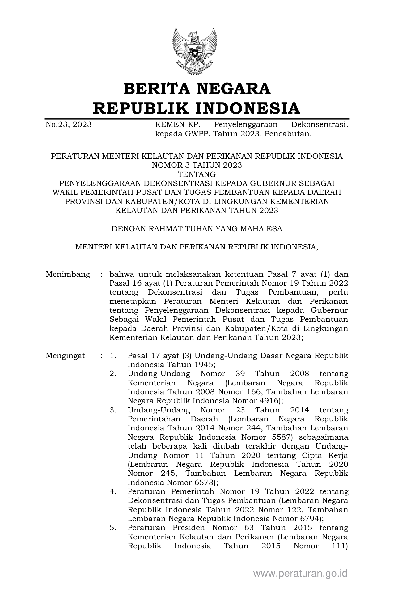 PERMEN Nomor 3 Tahun 2023 | Peraturan Menteri Nomor 3 Tahun 2023 tentang PENYELENGGARAAN DEKONSENTRASI KEPADA GUBERNUR SEBAGAI WAKIL PEMERINTAH PUSAT DAN TUGAS PEMBANTUAN KEPADA DAERAH PROVINSI DAN KABUPATEN/KOTA DI LINGKUNGAN KEMENTERIAN KELAUTAN DAN PERIKANAN TAHUN 2023