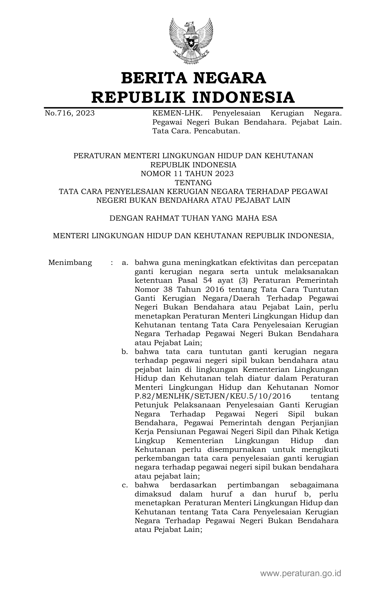 PERMEN Nomor 11 Tahun 2023 | Peraturan Menteri Nomor 11 Tahun 2023 tentang TATA CARA PENYELESAIAN KERUGIAN NEGARA TERHADAP PEGAWAI NEGERI BUKAN BENDAHARA ATAU PEJABAT LAIN
