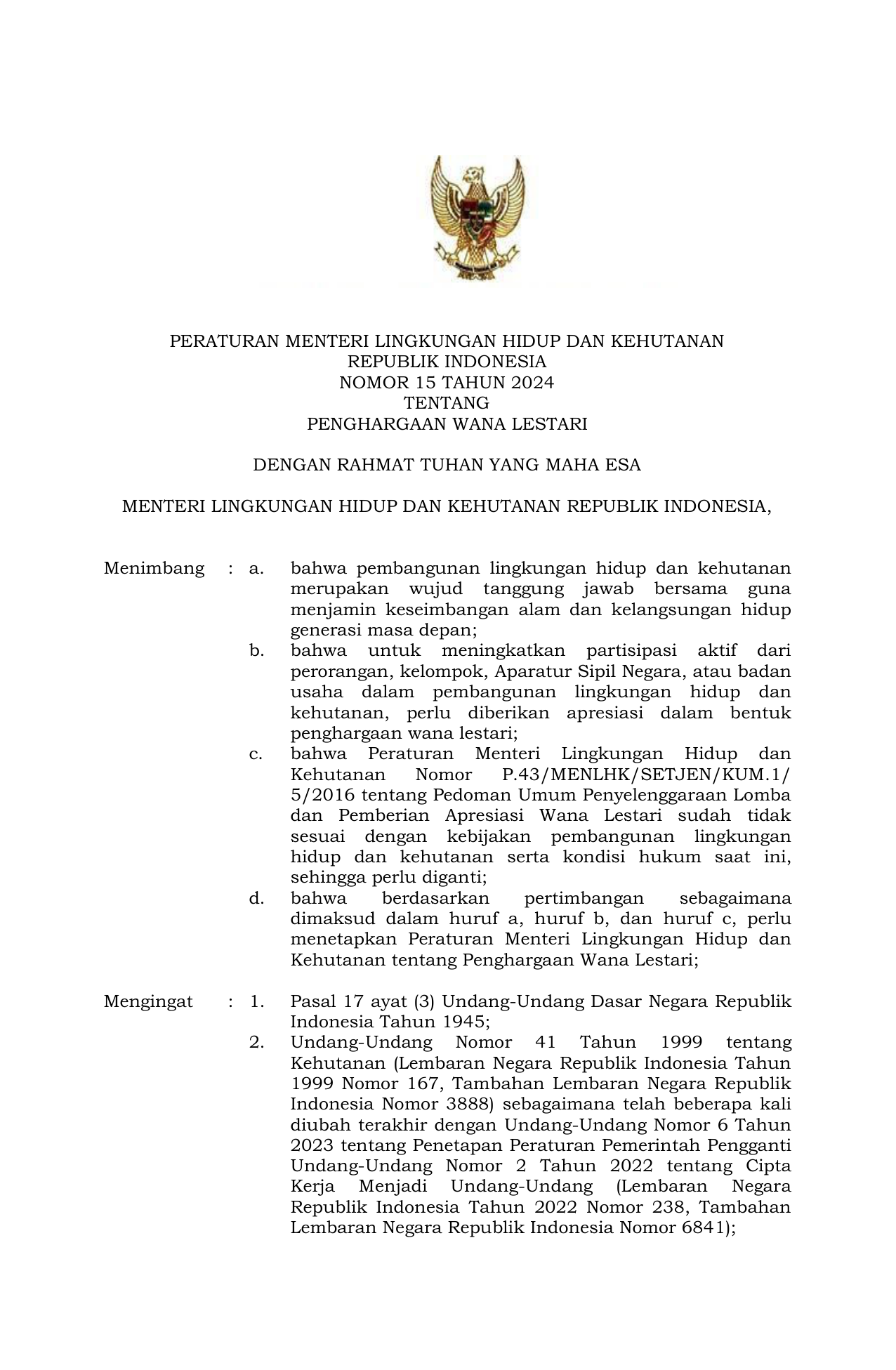 PERMEN Nomor 15 Tahun 2024 | Peraturan Menteri Nomor 15 Tahun 2024 tentang Penghargaan Wana Lestari