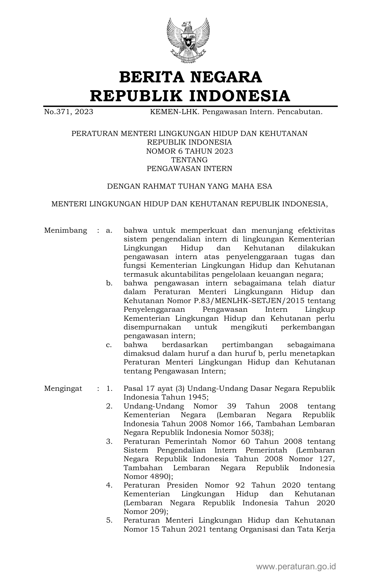 PERMEN Nomor 6 Tahun 2023 | Peraturan Menteri Nomor 6 Tahun 2023 tentang PENGAWASAN INTERN
