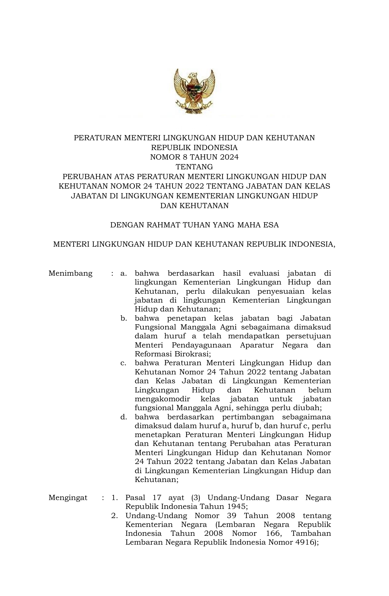 PERMEN Nomor 8 Tahun 2024 | Peraturan Menteri Nomor 8 Tahun 2024 tentang PERUBAHAN ATAS PERATURAN MENTERI LINGKUNGAN HIDUP DAN KEHUTANAN NOMOR 24 TAHUN 2022 TENTANG JABATAN DAN KELAS JABATAN DI LINGKUNGAN KEMENTERIAN LINGKUNGAN HIDUP DAN KEHUTANAN